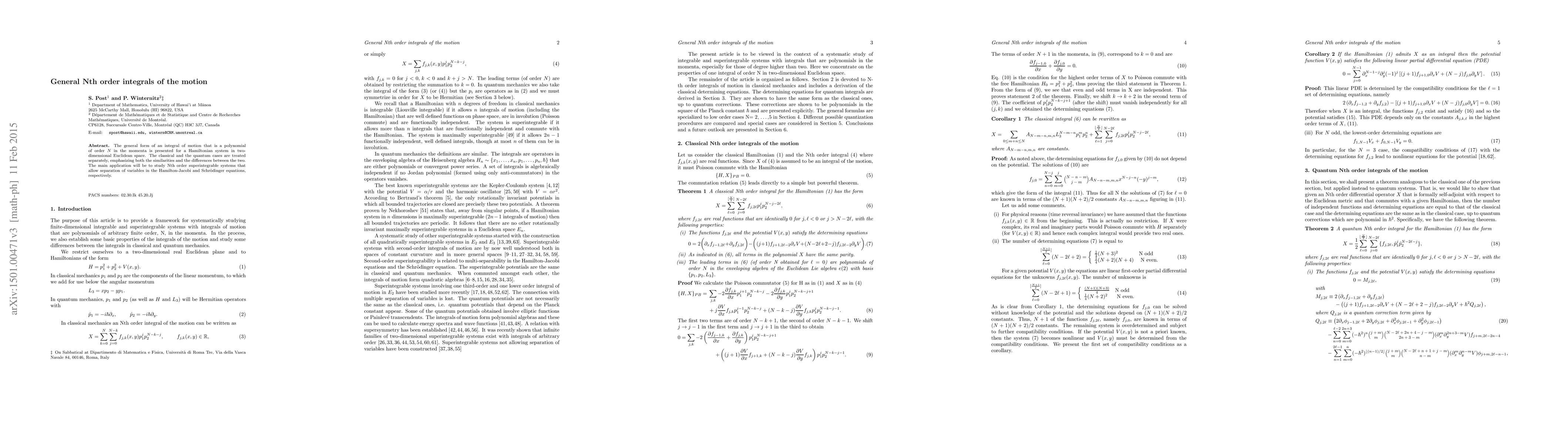 The general form of an integral of motion that is a polynomial of order N in the momenta is presented for a Hamiltonian system in two-dimensional Euclidean space. The classical and the quantum cases are treated separately, emphasizing both the similarities and the differences between the two. The main application will be to study Nth order superintegrable systems that allow separation of variables in the Hamilton-Jacobi and Schr\"odinger equations, respectively.