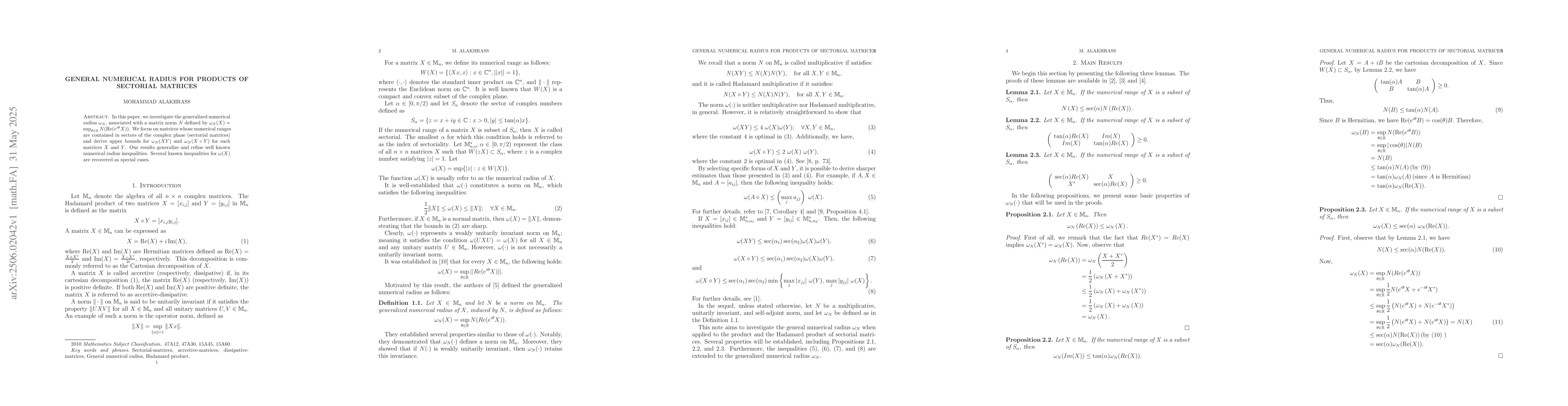 The paper investigates the generalized numerical radius $\omega_N$ associated with a matrix norm $N$, focusing on sectorial matrices and deriving upper bounds for $\omega_N(XY)$ and $\omega_N(X \circ Y)$ for such matrices $X$ and $Y$.