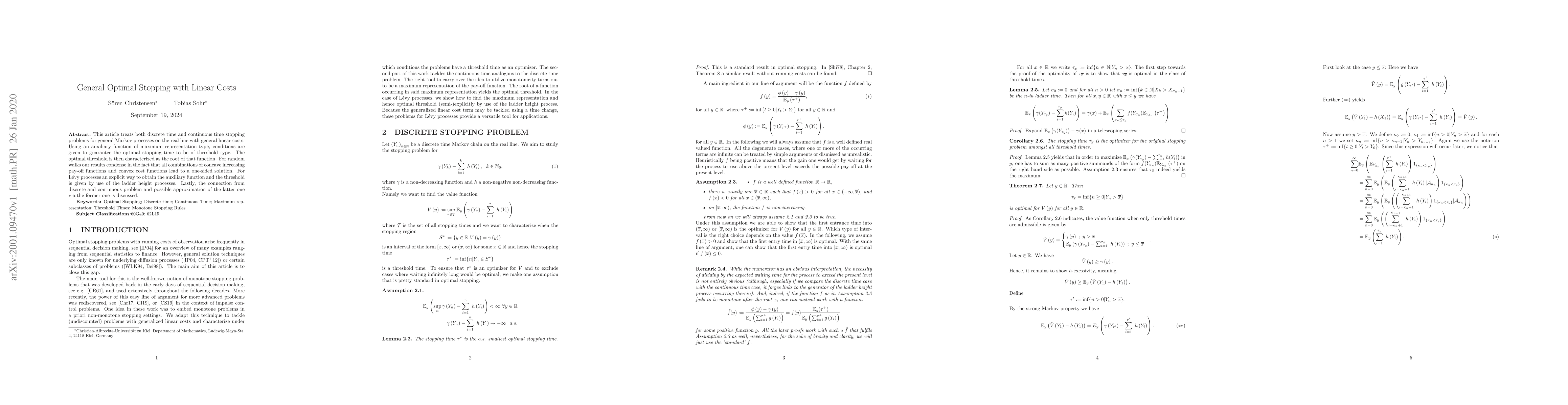 This article treats both discrete time and continuous time stopping problems for general Markov processes on the real line with general linear costs. Using an auxiliary function of maximum representation type, conditions are given to guarantee the optimal stopping time to be of threshold type. The optimal threshold is then characterized as the root of that function. For random walks our results condense in the fact that all combinations of concave increasing pay-off functions and convex cost functions lead to a one-sided solution. For L\'evy processes an explicit way to obtain the auxiliary function and the threshold is given by use of the ladder height processes. Lastly, the connection from discrete and continuous problem and possible approximation of the latter one via the former one is discussed.