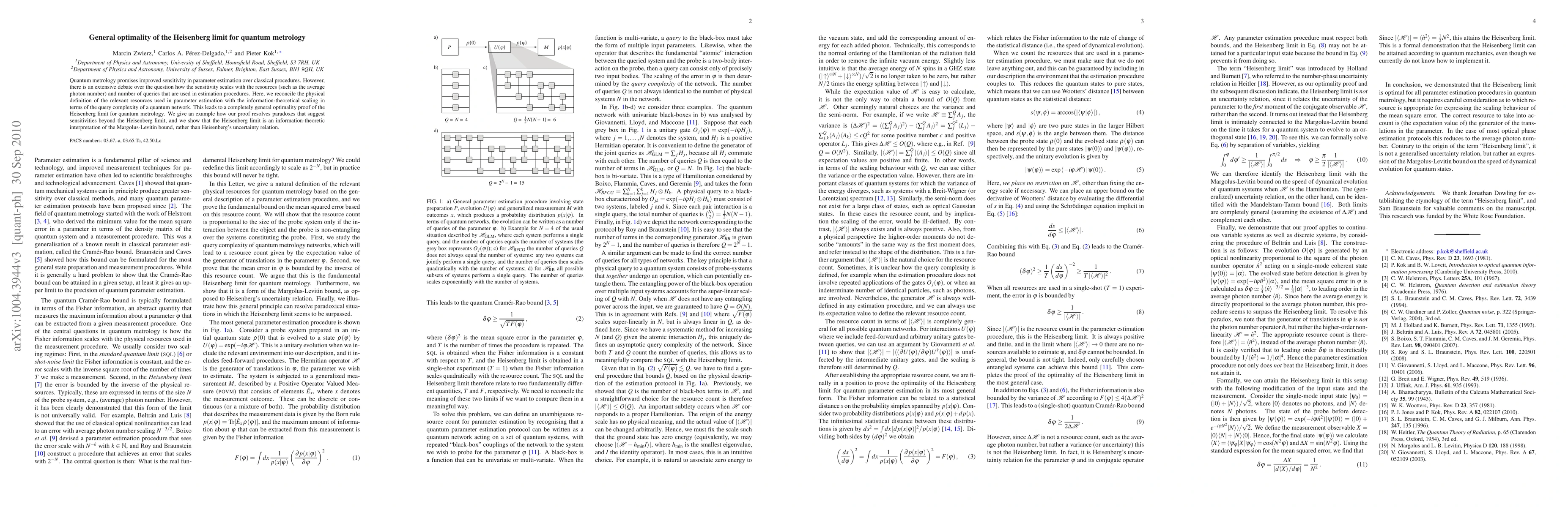 Quantum metrology promises improved sensitivity in parameter estimation over classical procedures. However, there is an extensive debate over the question how the sensitivity scales with the resources (such as the average photon number) and number of queries that are used in estimation procedures. Here, we reconcile the physical definition of the relevant resources used in parameter estimation with the information-theoretical scaling in terms of the query complexity of a quantum network. This leads to a completely general optimality proof of the Heisenberg limit for quantum metrology. We give an example how our proof resolves paradoxes that suggest sensitivities beyond the Heisenberg limit, and we show that the Heisenberg limit is an information-theoretic interpretation of the Margolus-Levitin bound, rather than Heisenberg's uncertainty relation.