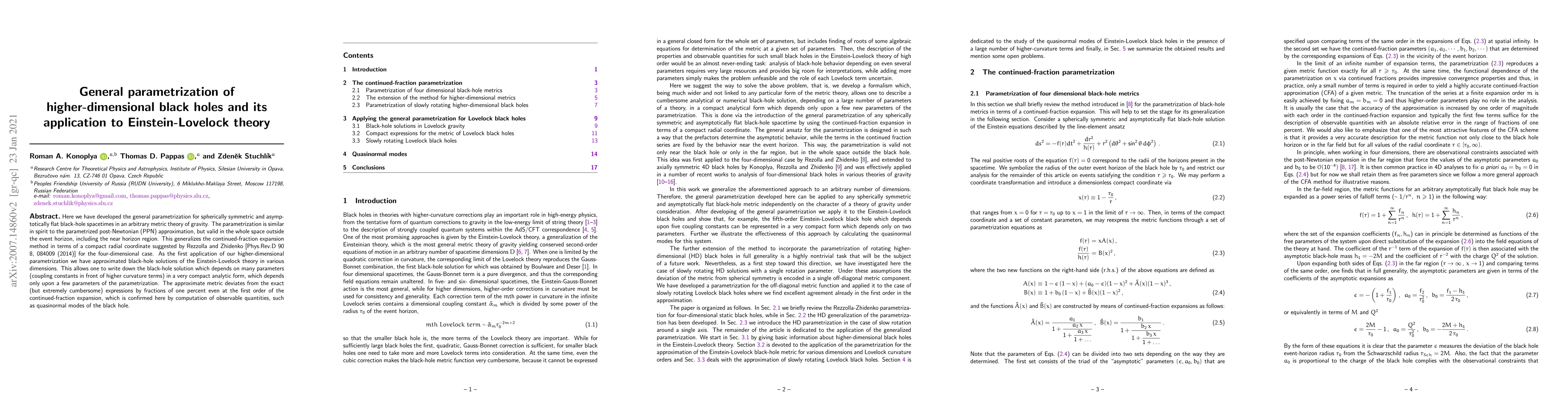 Here we have developed the general parametrization for spherically symmetric and asymptotically flat black-hole spacetimes in an arbitrary metric theory of gravity. The parametrization is similar in spirit to the parametrized post-Newtonian (PPN) approximation, but valid in the whole space outside the event horizon, including the near horizon region. This generalizes the continued-fraction expansion method in terms of a compact radial coordinate suggested by Rezzolla and Zhidenko [Phys.Rev.D 90 8, 084009 (2014)] for the four-dimensional case. As the first application of our higher-dimensional parametrization we have approximated black-hole solutions of the Einstein-Lovelock theory in various dimensions. This allows one to write down the black-hole solution which depends on many parameters (coupling constants in front of higher curvature terms) in a very compact analytic form, which depends only upon a few parameters of the parametrization. The approximate metric deviates from the exact (but extremely cumbersome) expressions by fractions of one percent even at the first order of the continued-fraction expansion, which is confirmed here by computation of observable quantities, such as quasinormal modes of the black hole.