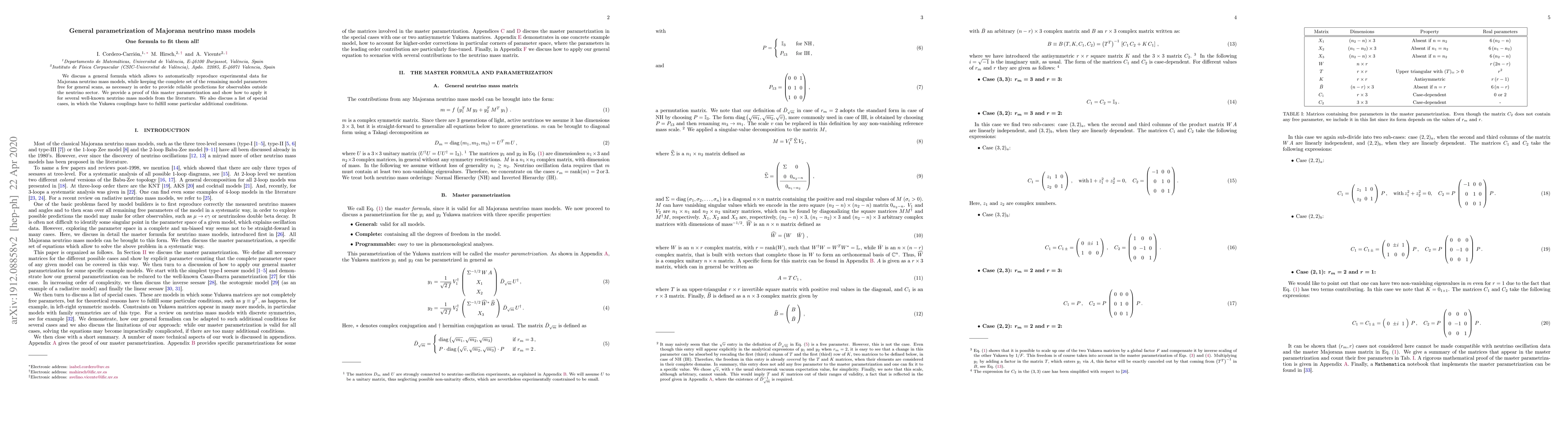 We discuss a general formula which allows to automatically reproduce experimental data for Majorana neutrino mass models, while keeping the complete set of the remaining model parameters free for general scans, as necessary in order to provide reliable predictions for observables outside the neutrino sector. We provide a proof of this master parametrization and show how to apply it for several well-known neutrino mass models from the literature. We also discuss a list of special cases, in which the Yukawa couplings have to fulfill some particular additional conditions.