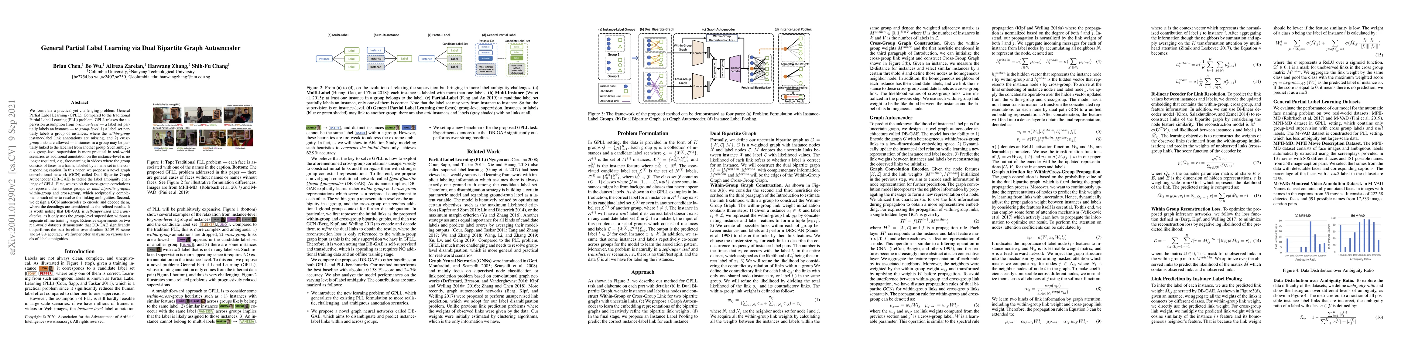 This paper introduces General Partial Label Learning (GPLL), which relaxes supervision from instance-level to group-level, proposing a Dual Bipartite Graph Autoencoder (DB-GAE) to handle label ambiguity. DB-GAE leverages cross-group correlations through graph convolutional networks to resolve linking ambiguities and outperforms baselines on real-world datasets.