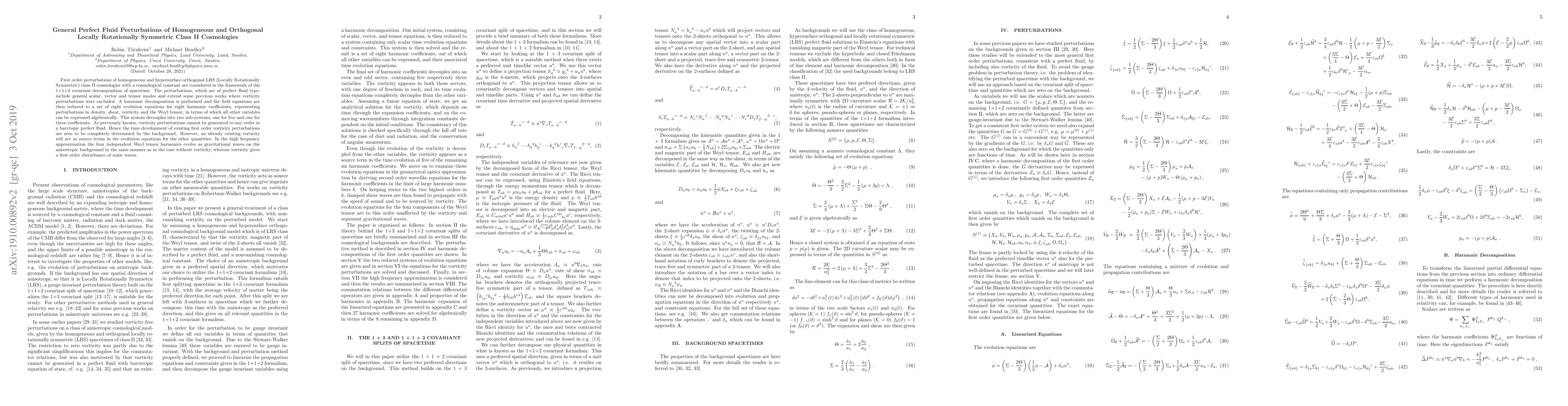 This paper investigates first-order perturbations of homogeneous and orthogonal Locally Rotationally Symmetric (LRS) class II cosmologies with a cosmological constant, focusing on perfect fluid perturbations including scalar, vector, and tensor modes. The study reveals that vorticity perturbations are determined by the background and act as source terms in the evolution of other quantities, while Weyl tensor harmonics behave like gravitational waves in high frequency approximations.