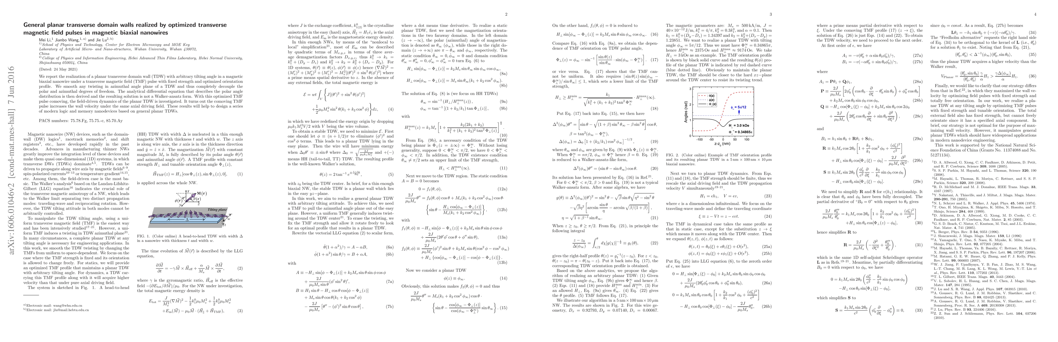 This paper reports the creation of a planar transverse domain wall in magnetic biaxial nanowires using optimized transverse magnetic field pulses, achieving decoupling of polar and azimuthal degrees of freedom. The study reveals that a comoving TMF pulse enhances the domain wall velocity, which could aid in the development of advanced logic and memory nanodevices.