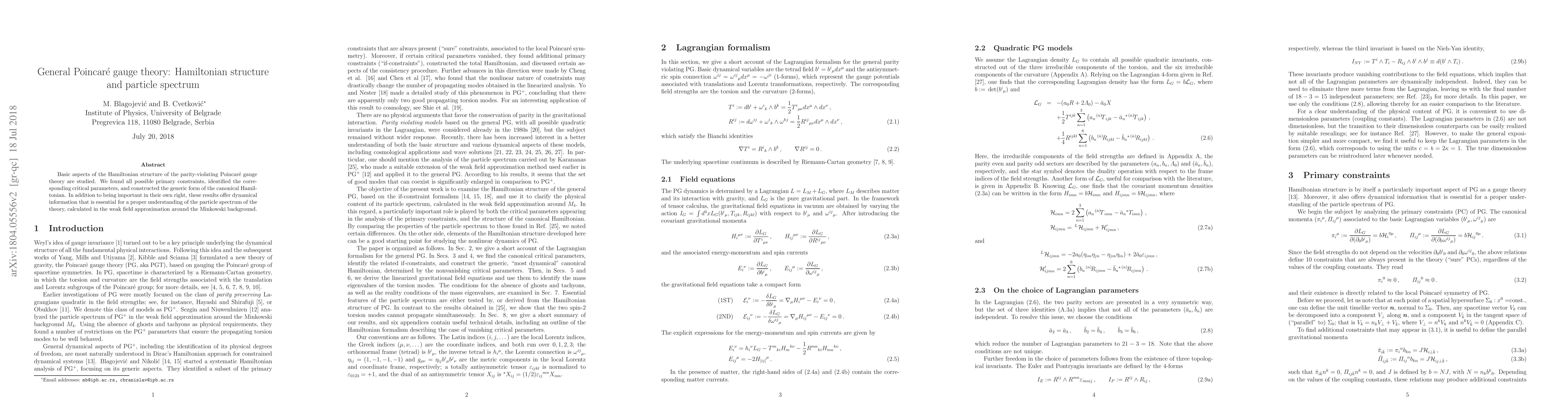 This paper investigates the Hamiltonian structure of parity-violating Poincaré gauge theory, identifying all primary constraints and constructing the canonical Hamiltonian. The findings are crucial for understanding the particle spectrum in the weak field approximation around Minkowski space.
