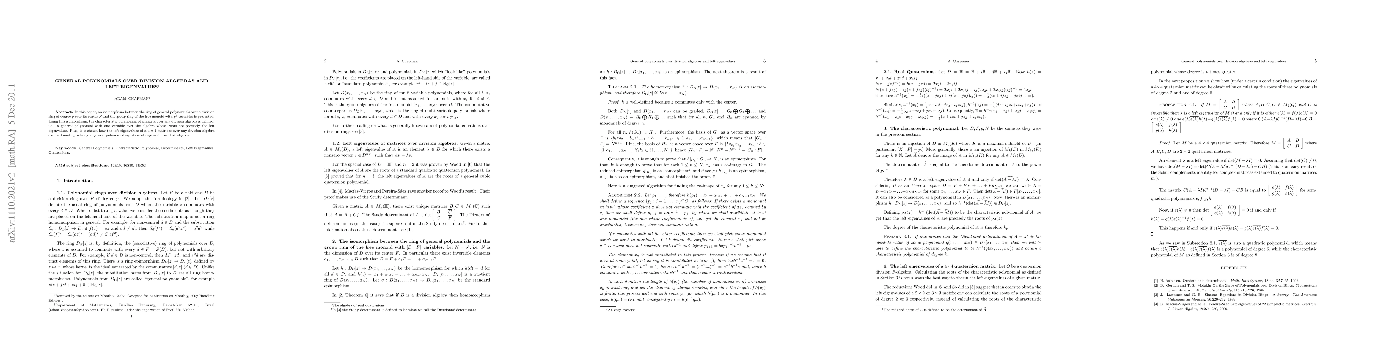 In this paper, we present an isomorphism between the ring of general polynomials over a division ring of degree $p$ over its center $F$ and the group ring of the free monoid with $p^2$ variables. Using this isomorphism, we define the characteristic polynomial of a matrix over any division algebra, i.e. a general polynomial with one variable over the algebra whose roots are precisely the left eigenvalues. Plus, we show how the left eigenvalues of a $4 \times 4$ matrices over any division algebra can be found by solving a general polynomial equation of degree 6 over that algebra.