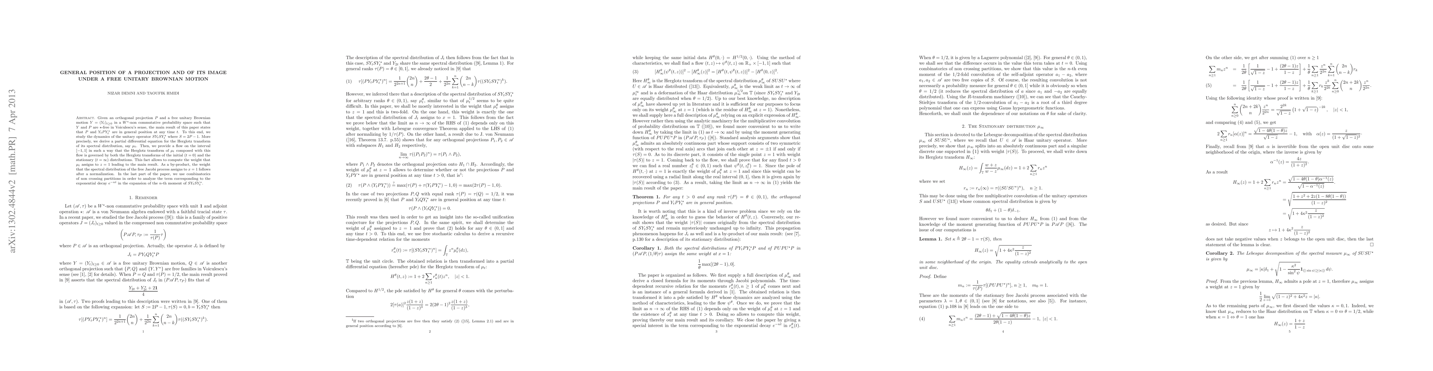 Given an orthogonal projection $P$ and a free unitary Brownian motion $Y = (Y_t)_{t \geq 0}$ in a $W^{\star}$-non commutative probability space such that $Y$ and $P$ are $\star$-free in Voiculescu's sense, the main result of this paper states that $P$ and $Y_tPY_t^{\star}$ are in general position at any time $t$. To this end, we study the dynamics of the unitary operator $SY_tSY_t^{\star}$ where $S = 2P-1$. More precisely, we derive a partial differential equation for the Herglotz transform of its spectral distribution, say $\mu_t$. Then, we provide a flow on the interval $[-1,1]$ in such a way that the Herglotz transform of $\mu_t$ composed with this flow is governed by both the Herglotz transforms of the initial ($t=0$) and the stationary ($t = \infty)$ distributions. This fact allows to compute the weight that $\mu_t$ assigns to $z=1$ leading to the main result. As a by-product, the weight that the spectral distribution of the free Jacobi process assigns to $x=1$ follows after a normalization. In the last part of the paper, we use combinatorics of non crossing partitions in order to analyze the term corresponding to the exponential decay $e^{-nt}$ in the expansion of the $n$-th moment of $SY_tSY_t^{\star}$.