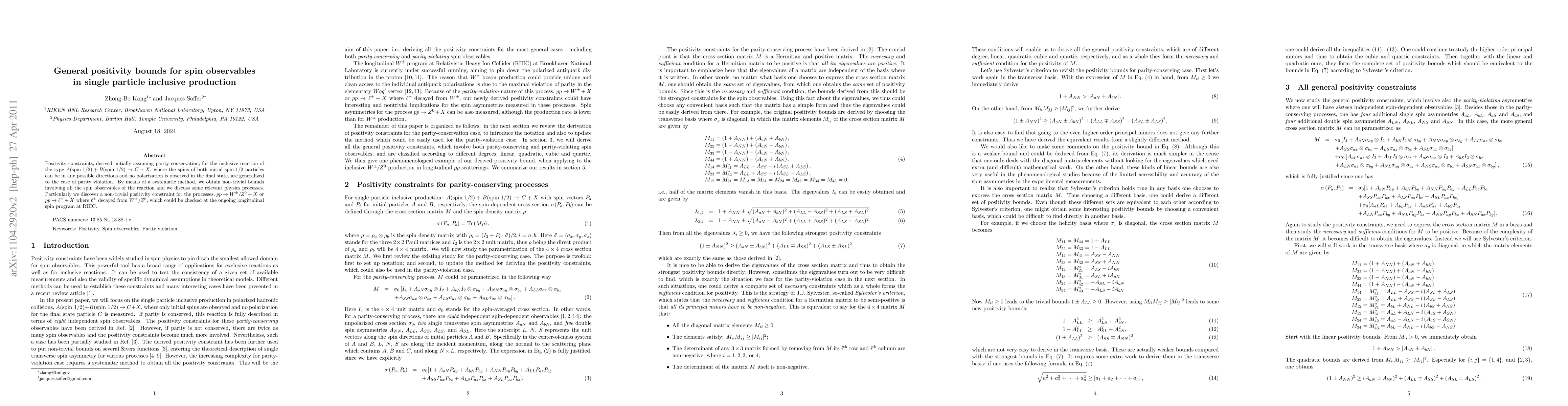Positivity constraints, derived initially assuming parity conservation, for the inclusive reaction of the type $A({spin 1/2})+B({spin 1/2})\to C+X$, where the spins of both initial spin-1/2 particles can be in any possible directions and no polarization is observed in the final state, are generalized to the case of parity violation. By means of a systematic method, we obtain non-trivial bounds involving all the spin observables of the reaction and we discuss some relevant physics processes. Particularly we discover a non-trivial positivity constraint for the processes, $pp\to W^{\pm}/Z^0+X$ or $pp\to \ell^{\pm}+X$ where $\ell^{\pm}$ decayed from $W^{\pm}/Z^0$, which could be checked at the ongoing longitudinal spin program at RHIC.