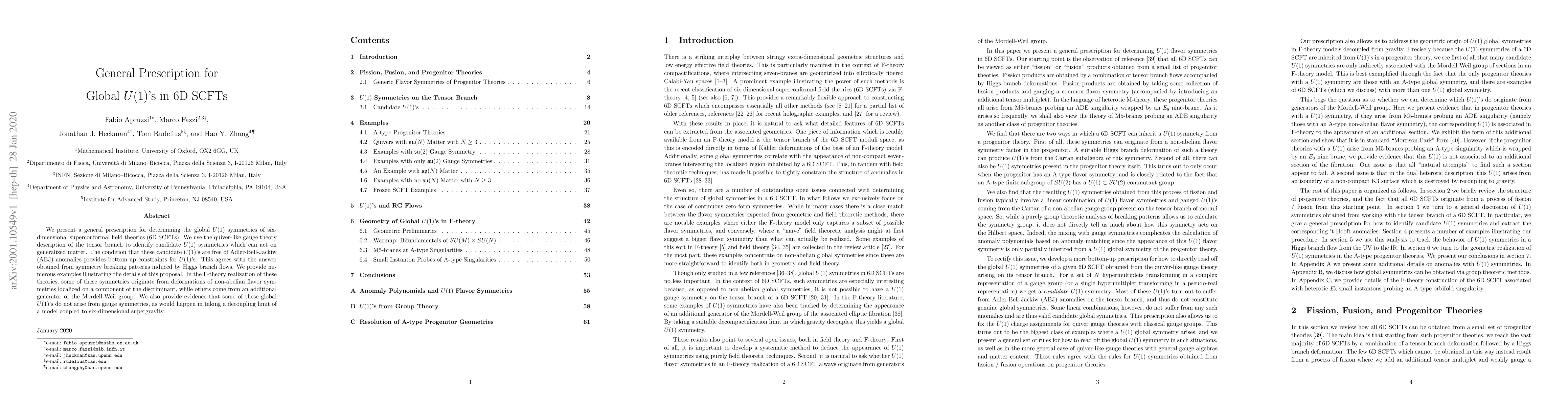 We present a general prescription for determining the global U(1) symmetries of six-dimensional superconformal field theories (6D SCFTs). We use the quiver-like gauge theory description of the tensor branch to identify candidate U(1) symmetries which can act on generalized matter. The condition that these candidate U(1)'s are free of Adler-Bell-Jackiw (ABJ) anomalies provides bottom-up constraints for U(1)'s. This agrees with the answer obtained from symmetry breaking patterns induced by Higgs branch flows. We provide numerous examples illustrating the details of this proposal. In the F-theory realization of these theories, some of these symmetries originate from deformations of non-abelian flavor symmetries localized on a component of the discriminant, while others come from an additional generator of the Mordell-Weil group. We also provide evidence that some of these global U(1)'s do not arise from gauge symmetries, as would happen in taking a decoupling limit of a model coupled to six-dimensional supergravity.