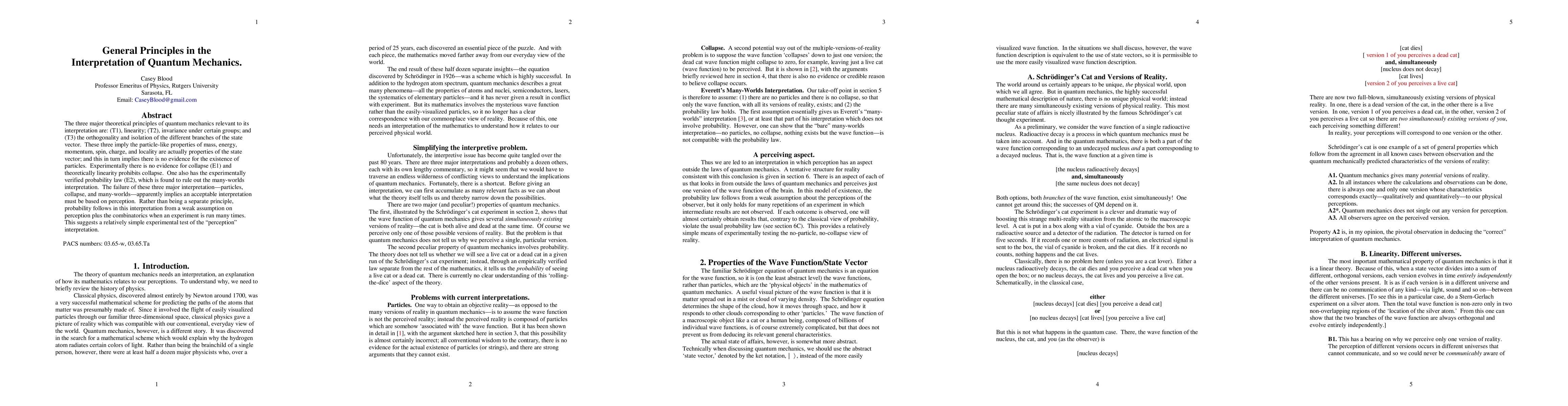 The three major theoretical principles of quantum mechanics relevant to its interpretation are: (T1), linearity; (T2), invariance under certain groups; and (T3) the orthogonality and isolation of the different branches of the state vector. These three imply the particle-like properties of mass, energy, momentum, spin, charge, and locality are actually properties of the state vector; and this in turn implies there is no evidence for the existence of particles. Experimentally there is no evidence for collapse (E1) and theoretically linearity prohibits collapse. One also has the experimentally verified probability law (E2), which is found to rule out the many-worlds interpretation. The failure of these three major interpretation, particles, collapse, and many-worlds, apparently implies an acceptable interpretation must be based on perception. Rather than being a separate principle, probability follows in this interpretation from a weak assumption on perception plus the combinatorics when an experiment is run many times. This suggests a relatively simple experimental test of the perception interpretation.