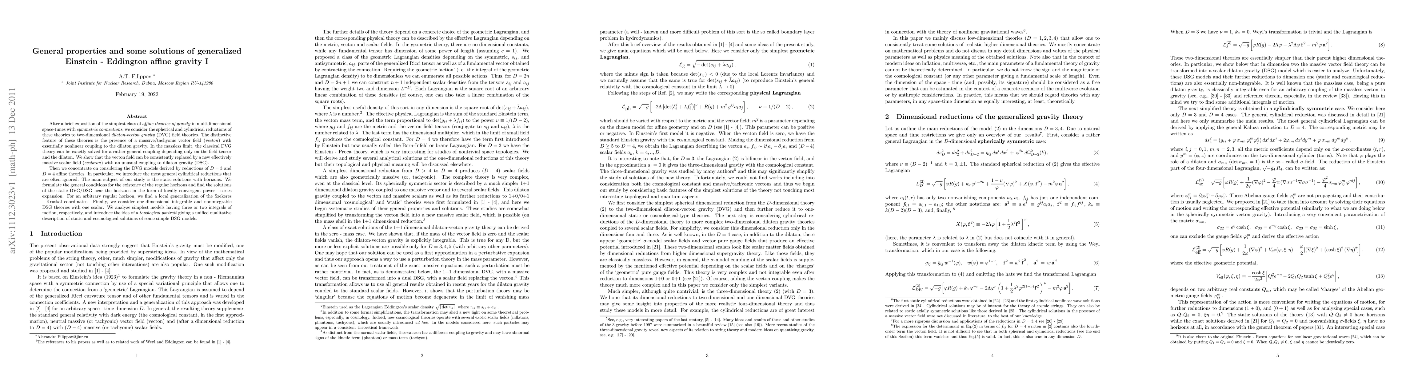 This paper explores generalized Einstein-Eddington affine gravity in multidimensional space-times, focusing on reductions to two-dimensional dilaton-vecton gravity (DVG) field theories. It investigates static solutions with horizons and presents locally convergent power series expansions for these solutions, introducing a `topological portrait' for qualitative descriptions of static and cosmological solutions.