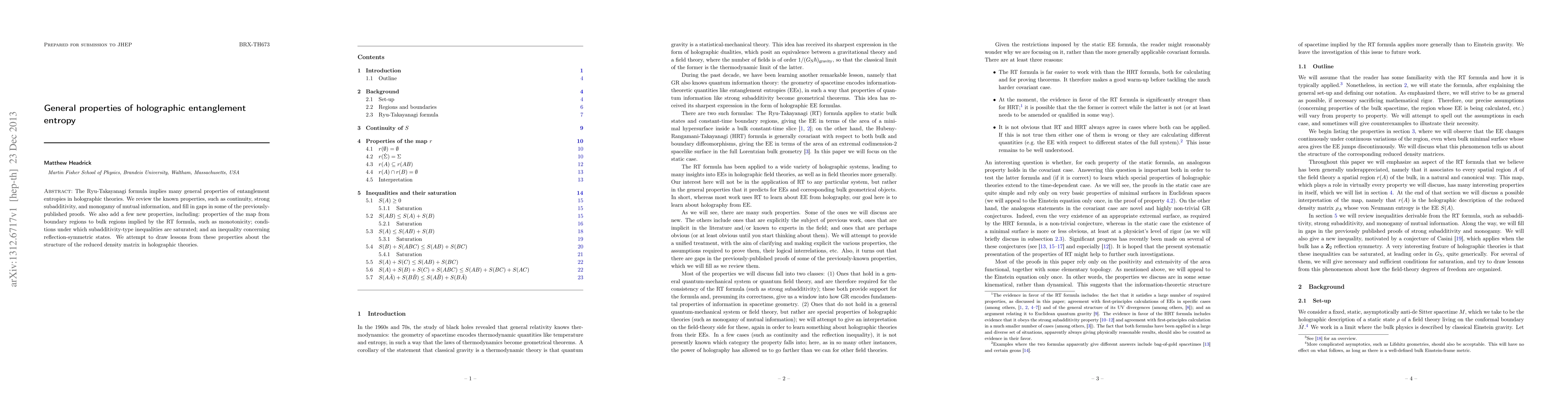 This paper reviews known properties of holographic entanglement entropy, including continuity, strong subadditivity, and monogamy of mutual information, while also introducing new properties such as monotonicity and reflection-symmetry conditions. The study aims to draw lessons about the structure of reduced density matrices in holographic theories.