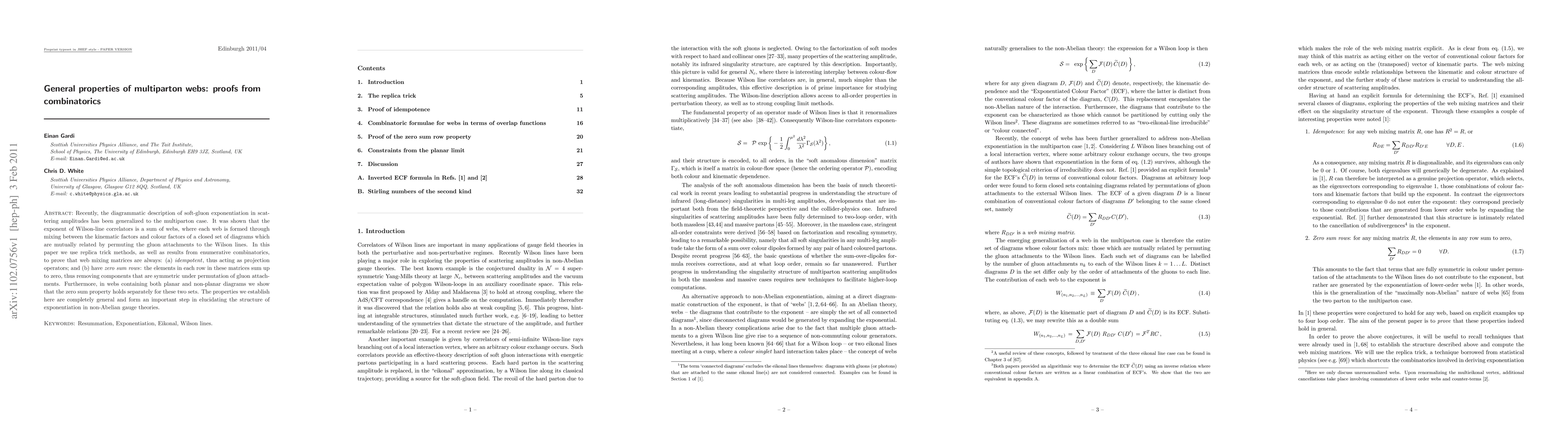 This paper proves general properties of multiparton webs using combinatorial methods, showing that web mixing matrices are idempotent projection operators and have zero-sum rows, which eliminates symmetric components and clarifies exponentiation in non-Abelian gauge theories.
