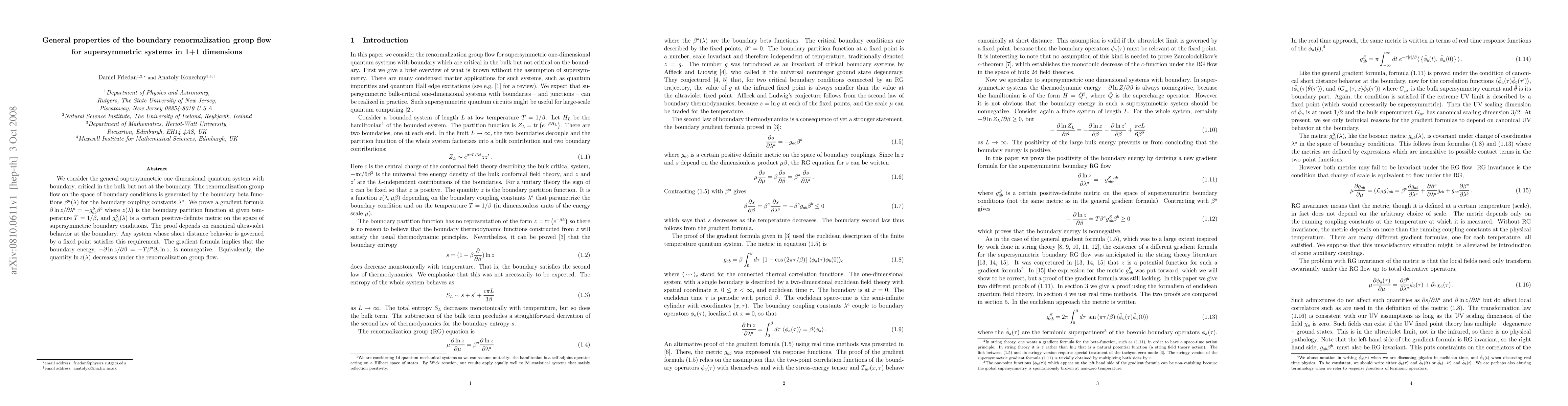 We consider the general supersymmetric one-dimensional quantum system with boundary, critical in the bulk but not at the boundary. The renormalization group flow on the space of boundary conditions is generated by the boundary beta functions \beta^{a}(\lambda) for the boundary coupling constants \lambda^{a}. We prove a gradient formula \partial\ln z/\partial\lambda^{a} =-g_{ab}^{S}\beta^{b} where z(\lambda) is the boundary partition function at given temperature T=1/\beta, and g_{ab}^{S}(\lambda) is a certain positive-definite metric on the space of supersymmetric boundary conditions. The proof depends on canonical ultraviolet behavior at the boundary. Any system whose short distance behavior is governed by a fixed point satisfies this requirement. The gradient formula implies that the boundary energy, -\partial\ln z/\partial\beta = -T\beta^{a}\partial_{a}\ln z, is nonnegative. Equivalently, the quantity \ln z(\lambda) decreases under the renormalization group flow.