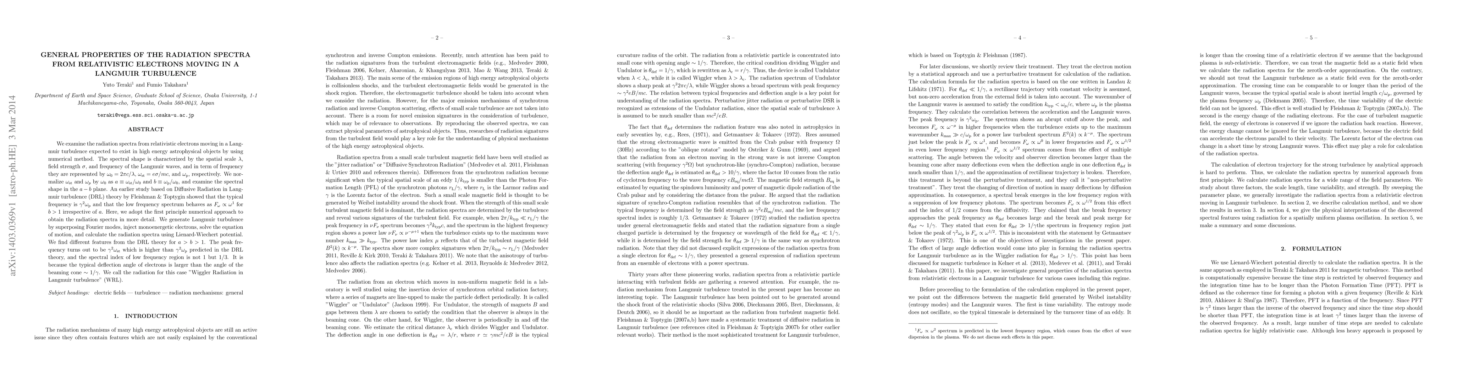 We examine the radiation spectra from relativistic electrons moving in a Langmuir turbulence expected to exist in high energy astrophysical objects by using numerical method. The spectral shape is characterized by the spatial scale {\lambda}, field strength {\sigma}, and frequency of the Langmuir waves, and in term of frequency they are represented by {\omega}_0 = 2{\pi}c/{\lambda}, {\omega}_st = e{\sigma}/mc, and {\omega}_p, respectively. We normalize {\omega}_st and {\omega}_p by {\omega}_0 as \a \equiv {\omega}_st/{\omega}_0 and \b \equiv{\omega}_p/{\omega}_0, and examine the spectral shape in the a-b plane. An earlier study based on Diffusive Radiation in Langmuir turbulence (DRL) theory by Fleishman and Toptygin showed that the typical frequency is {\gamma}^2{\omega}_p and that the low frequency spectrum behaves as F_{\omega} pronto {\omega}^1 for b > 1 irrespective of a. Here, we adopt the first principle numerical approach to obtain the radiation spectra in more detail. We generate Langmuir turbulence by superposing Fourier modes,inject monoenergetic electrons, solve the equation of motion, and calculate the radiation spectra using Lienard-Wiechert potential. We find different features from the DRL theory for a>b>1. The peak frequency turns out to be {\gamma}^2{\omega}_st which is higher than {\gamma}^2{\omega}_p predicted in the DRL theory, and the spectral index of low frequency region is not 1 but 1/3. It is because the typical deflection angle of electrons is larger than the angle of the beaming cone sim 1/{\gamma}. We call the radiation for this case "Wiggler Radiation in Langmuir turbulence" (WRL).