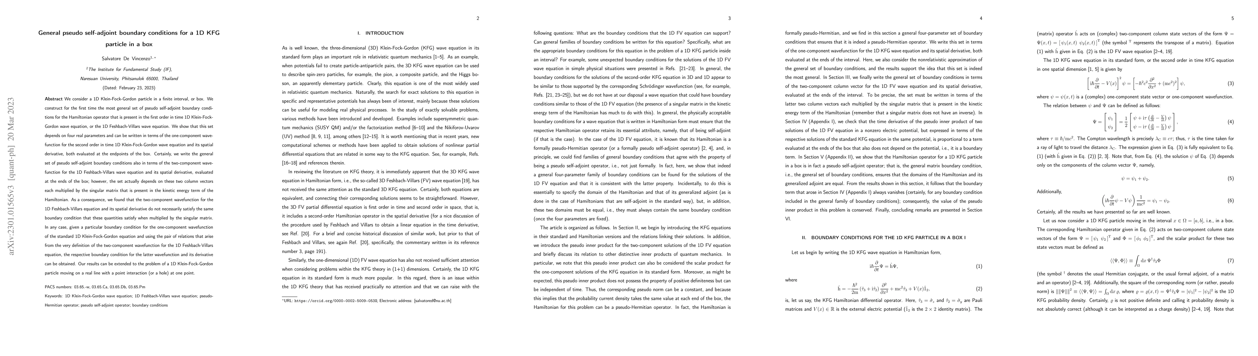 This paper constructs the most general set of pseudo self-adjoint boundary conditions for a 1D Klein-Fock-Gordon particle in a box, showing that it depends on four real parameters and can be expressed in terms of the wavefunction and its derivative at the box's endpoints. The study also extends these conditions to a particle on a real line with a point interaction.