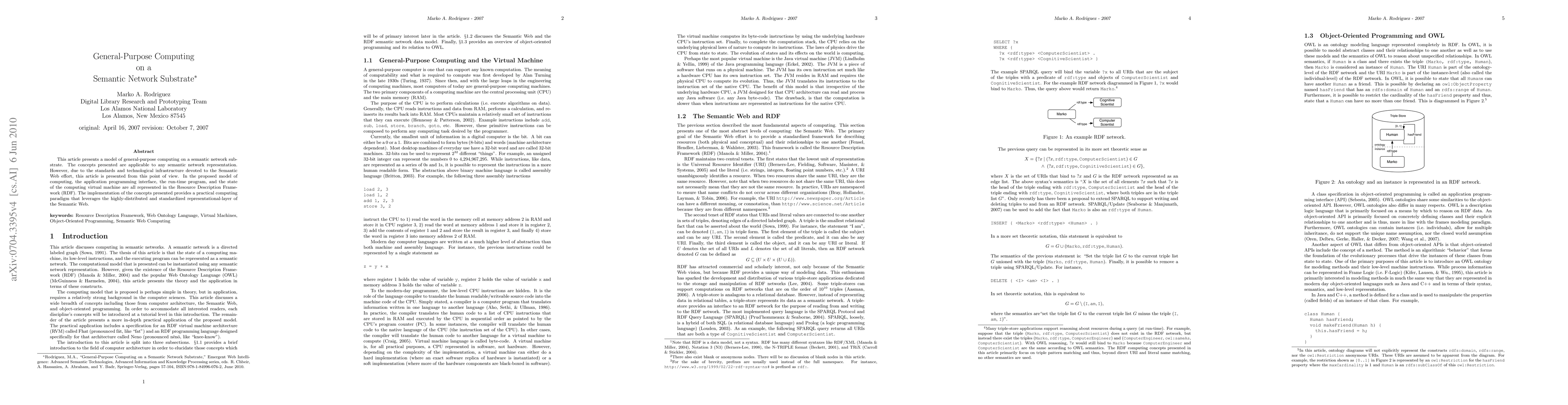 This article presents a model of general-purpose computing on a semantic network substrate. The concepts presented are applicable to any semantic network representation. However, due to the standards and technological infrastructure devoted to the Semantic Web effort, this article is presented from this point of view. In the proposed model of computing, the application programming interface, the run-time program, and the state of the computing virtual machine are all represented in the Resource Description Framework (RDF). The implementation of the concepts presented provides a practical computing paradigm that leverages the highly-distributed and standardized representational-layer of the Semantic Web.