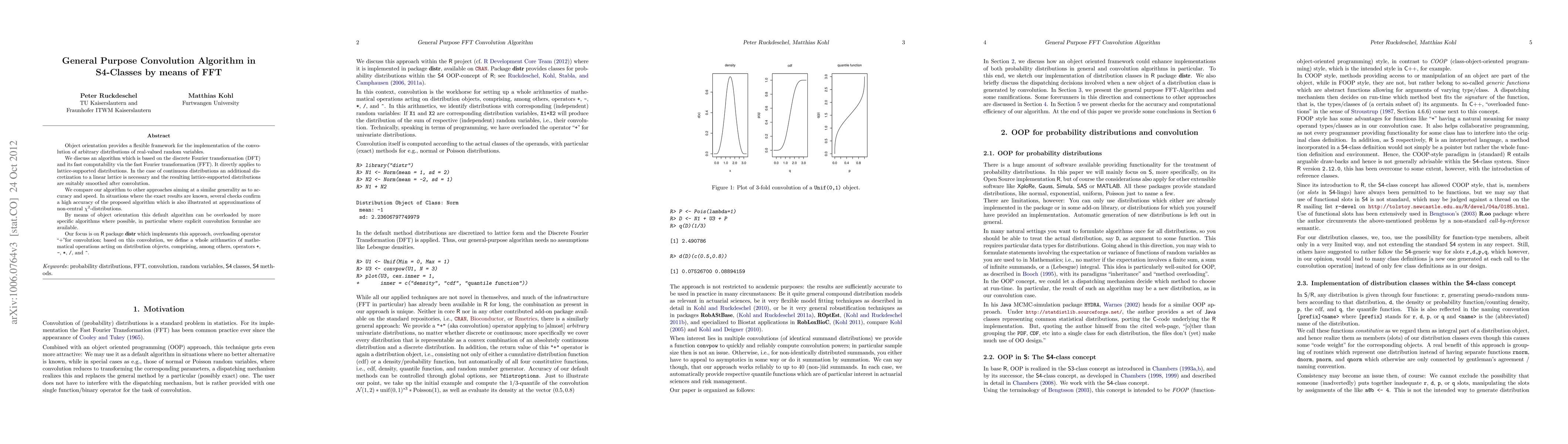 Object orientation provides a flexible framework for the implementation of the convolution of arbitrary distributions of real-valued random variables. We discuss an algorithm which is based on the discrete Fourier transformation (DFT) and its fast computability via the fast Fourier transformation (FFT). It directly applies to lattice-supported distributions. In the case of continuous distributions an additional discretization to a linear lattice is necessary and the resulting lattice-supported distributions are suitably smoothed after convolution. We compare our algorithm to other approaches aiming at a similar generality as to accuracy and speed. In situations where the exact results are known, several checks confirm a high accuracy of the proposed algorithm which is also illustrated at approximations of non-central $\chi^2$-distributions. By means of object orientation this default algorithm can be overloaded by more specific algorithms where possible, in particular where explicit convolution formulae are available. Our focus is on R package distr which includes an implementation of this approach overloading operator "+" for convolution; based on this convolution, we define a whole arithmetics of mathematical operations acting on distribution objects, comprising, among others, operators "+", "-", "*", "/", and "^".