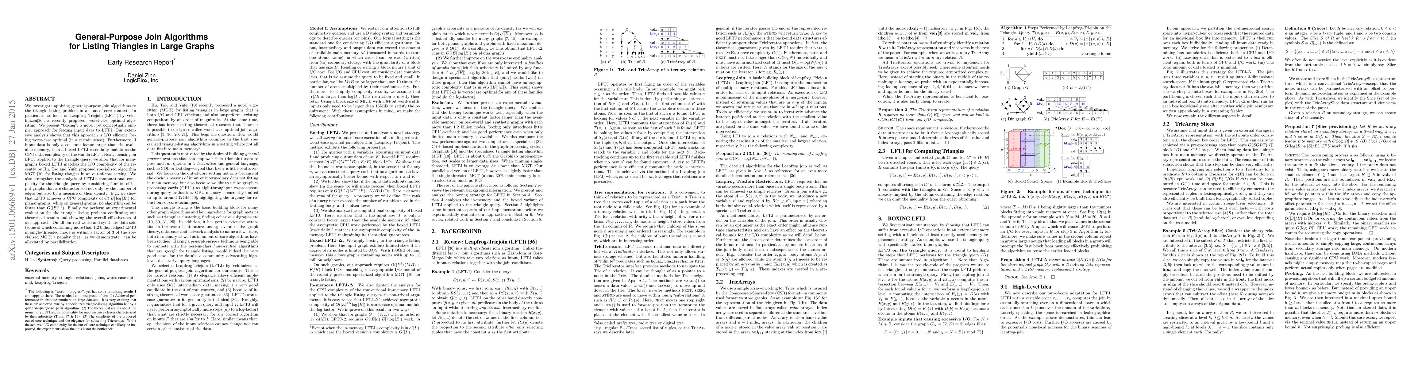 This paper explores the application of general-purpose join algorithms, specifically Leapfrog Triejoin (LFTJ), to efficiently list triangles in large out-of-core graphs. The authors introduce "boxing" to feed data to LFTJ, demonstrating its I/O efficiency and worst-case optimality. They show that LFTJ matches the I/O complexity of a specialized algorithm for many graphs and achieve O(|E|log|E|) CPU complexity for planar graphs. Experimental results confirm the theoretical findings and suggest parallelization can reduce performance penalties.