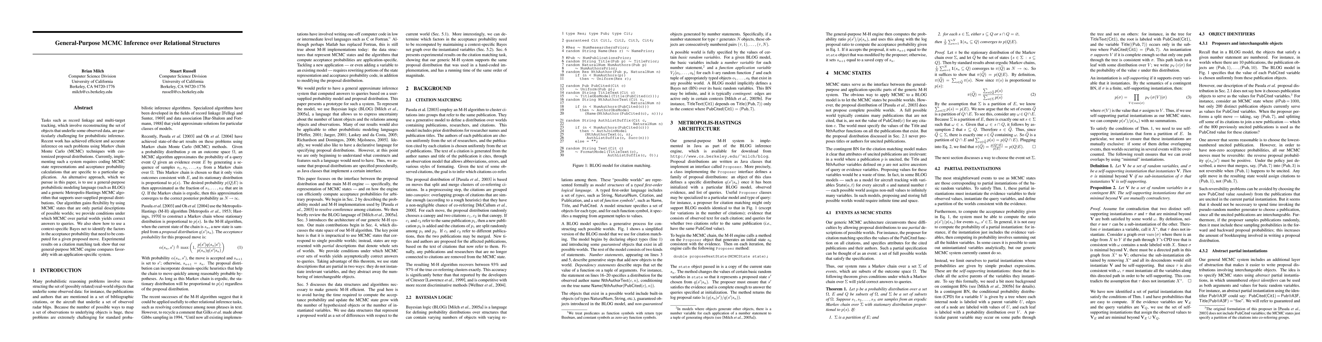 Tasks such as record linkage and multi-target tracking, which involve reconstructing the set of objects that underlie some observed data, are particularly challenging for probabilistic inference. Recent work has achieved efficient and accurate inference on such problems using Markov chain Monte Carlo (MCMC) techniques with customized proposal distributions. Currently, implementing such a system requires coding MCMC state representations and acceptance probability calculations that are specific to a particular application. An alternative approach, which we pursue in this paper, is to use a general-purpose probabilistic modeling language (such as BLOG) and a generic Metropolis-Hastings MCMC algorithm that supports user-supplied proposal distributions. Our algorithm gains flexibility by using MCMC states that are only partial descriptions of possible worlds; we provide conditions under which MCMC over partial worlds yields correct answers to queries. We also show how to use a context-specific Bayes net to identify the factors in the acceptance probability that need to be computed for a given proposed move. Experimental results on a citation matching task show that our general-purpose MCMC engine compares favorably with an application-specific system.