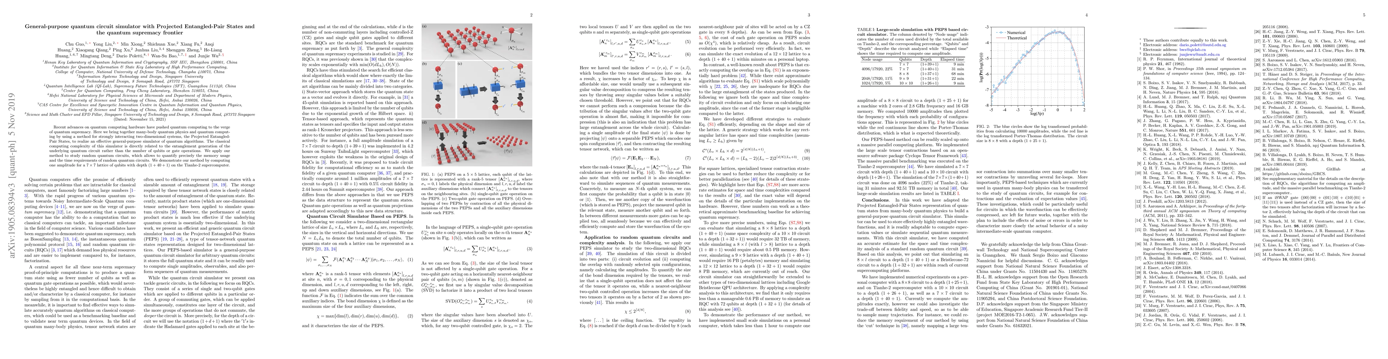 This paper introduces a general-purpose quantum circuit simulator utilizing Projected Entangled-Pair States, enabling precise quantification of memory and time for random quantum circuits, thereby demonstrating the frontier of quantum supremacy. The authors successfully simulated a $7\times 7$ lattice of qubits with a circuit depth of $1+40+1$ on the Tianhe-2 supercomputer, using less than 93 TB of memory in 31 minutes.