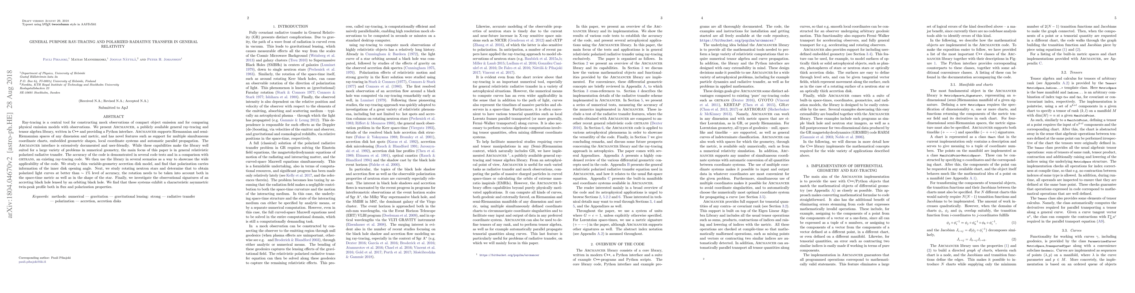 Ray-tracing is a central tool for constructing mock observations of compact object emission and for comparing physical emission models with observations. We present Arcmancer, a publicly available general ray-tracing and tensor algebra library, written in C++ and providing a Python interface. Arcmancer supports Riemannian and semi-Riemannian spaces of any dimension and metric, and has novel features such as support for multiple simultaneous coordinate charts, embedded geometric shapes, local coordinate systems and automatic parallel propagation. The Arcmancer interface is extensively documented and user-friendly. While these capabilities make the library well suited for a large variety of problems in numerical geometry, the main focus of this paper is in general relativistic polarized radiative transfer. The accuracy of the code is demonstrated in several code tests and in a comparison with GRTRANS, an existing ray-tracing code. We then use the library in several scenarios as a way to showcase the wide applicability of the code. We study a thin variable-geometry accretion disk model, and find that polarization carries information of the inner disk opening angle. Next, we study rotating neutron stars and determine that to obtain polarized light curves at better than $\sim1\%$ level of accuracy, the rotation needs to be taken into account both in the space-time metric as well as in the shape of the star. Finally, we investigate the observational signatures of an accreting black hole lensed by an orbiting black hole. We find that these systems exhibit a characteristic asymmetric twin-peak profile both in flux and polarization properties.