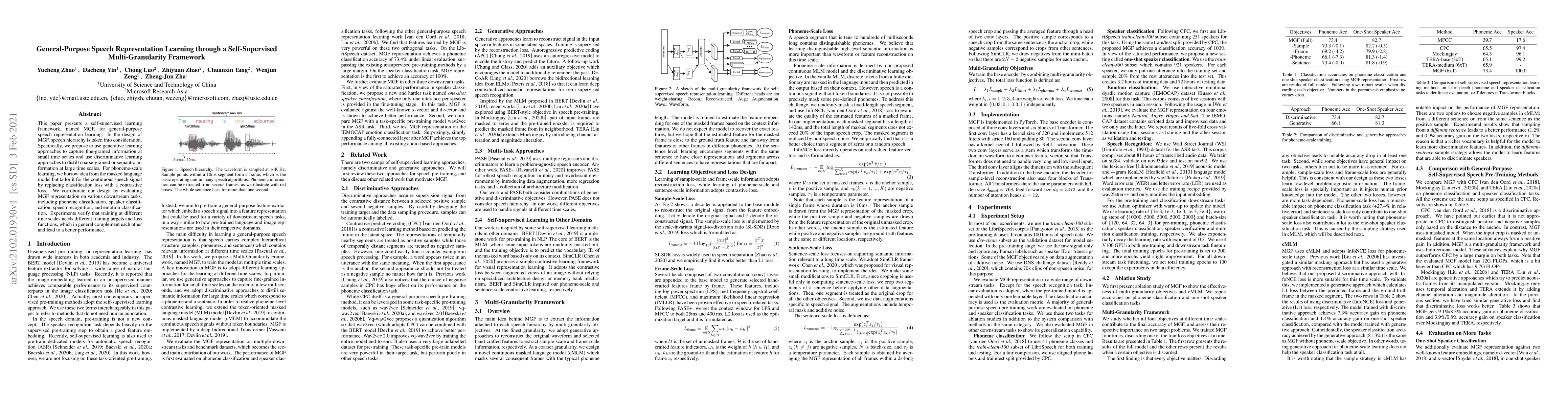 This paper introduces MGF, a self-supervised learning framework for general-purpose speech representation learning that considers speech hierarchy. It employs generative and discriminative learning to capture fine- and coarse-grained information, respectively, and achieves better performance across various tasks by training at different time scales with complementary loss functions.