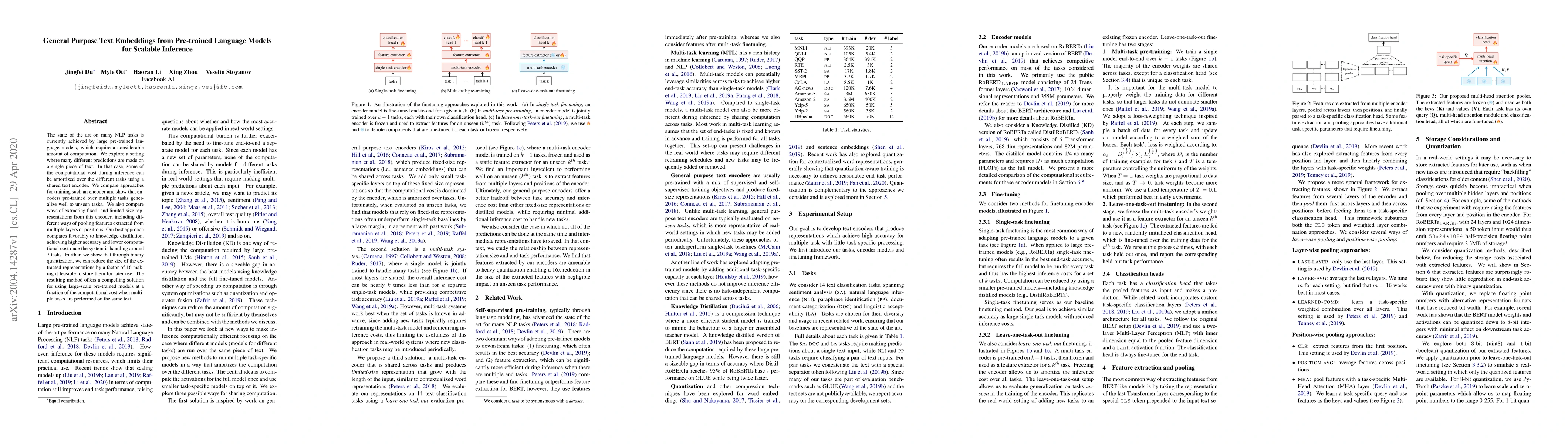The state of the art on many NLP tasks is currently achieved by large pre-trained language models, which require a considerable amount of computation. We explore a setting where many different predictions are made on a single piece of text. In that case, some of the computational cost during inference can be amortized over the different tasks using a shared text encoder. We compare approaches for training such an encoder and show that encoders pre-trained over multiple tasks generalize well to unseen tasks. We also compare ways of extracting fixed- and limited-size representations from this encoder, including different ways of pooling features extracted from multiple layers or positions. Our best approach compares favorably to knowledge distillation, achieving higher accuracy and lower computational cost once the system is handling around 7 tasks. Further, we show that through binary quantization, we can reduce the size of the extracted representations by a factor of 16 making it feasible to store them for later use. The resulting method offers a compelling solution for using large-scale pre-trained models at a fraction of the computational cost when multiple tasks are performed on the same text.