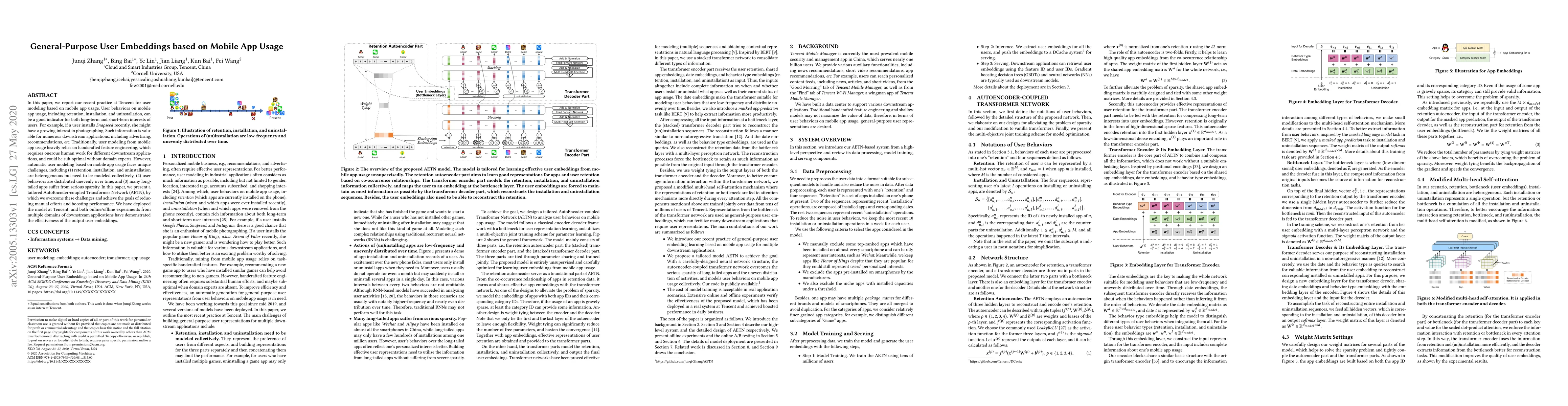 This paper introduces an AutoEncoder-coupled Transformer Network (AETN) for generating general-purpose user embeddings from mobile app usage data, addressing challenges like heterogeneity and sparsity. The model reduces manual feature engineering efforts and improves performance for various downstream applications.