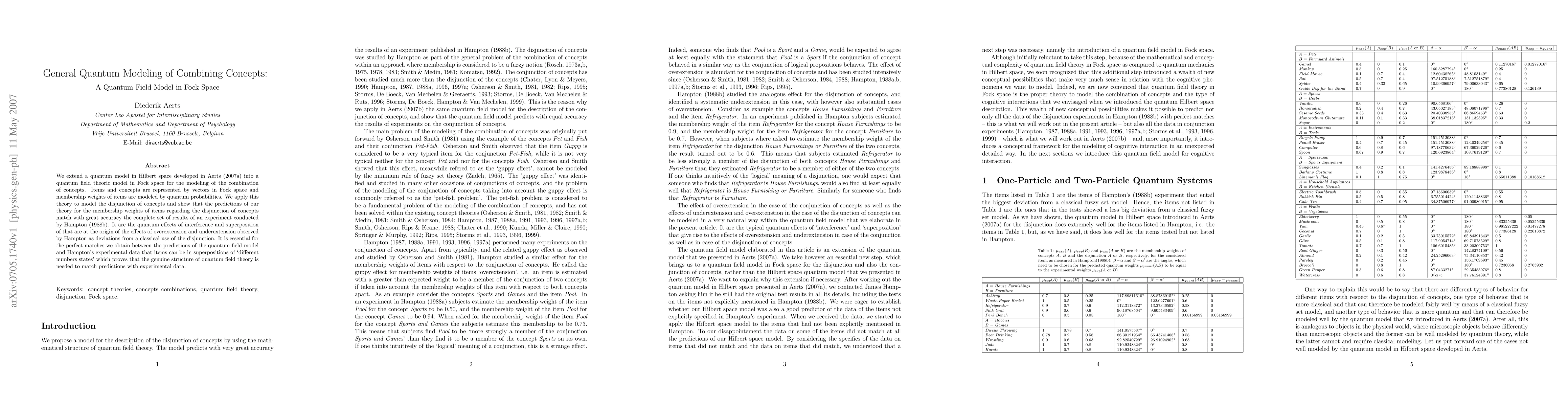 We extend a quantum model in Hilbert space developed in Aerts (2007a) into a quantum field theoric model in Fock space for the modeling of the combination of concepts. Items and concepts are represented by vectors in Fock space and membership weights of items are modeled by quantum probabilities. We apply this theory to model the disjunction of concepts and show that the predictions of our theory for the membership weights of items regarding the disjunction of concepts match with great accuracy the complete set of results of an experiment conducted by Hampton (1988b). It are the quantum effects of interference and superposition of that are at the origin of the effects of overextension and underextension observed by Hampton as deviations from a classical use of the disjunction. It is essential for the perfect matches we obtain between the predictions of the quantum field model and Hampton's experimental data that items can be in superpositions of `different numbers states' which proves that the genuine structure of quantum field theory is needed to match predictions with experimental data.