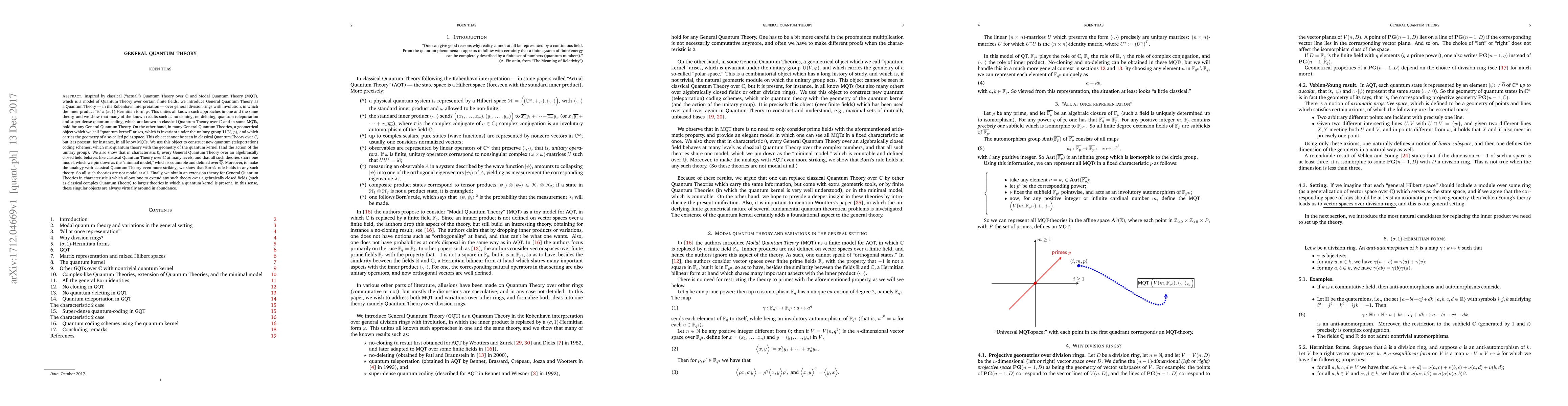 Inspired by classical ("actual") Quantum Theory over $\mathbb{C}$ and Modal Quantum Theory (MQT), which is a model of Quantum Theory over certain finite fields, we introduce General Quantum Theory as a Quantum Theory -- in the K{\o}benhavn interpretation -- over general division rings with involution, in which the inner product "is" a $(\sigma,1)$-Hermitian form $\varphi$. This unites all known such approaches in one and the same theory, and we show that many of the known results such as no-cloning, no-deleting, quantum teleportation and super-dense quantum coding, which are known in classical Quantum Theory over $\mathbb{C}$ and in some MQTs, hold for any General Quantum Theory. On the other hand, in many General Quantum Theories, a geometrical object which we call "quantum kernel" arises, which is invariant under the unitary group $\mathbf{U}(V,\varphi)$, and which carries the geometry of a so-called polar space. We use this object to construct new quantum (teleportation) coding schemes, which mix quantum theory with the geometry of the quantum kernel (and the action of the unitary group). We also show that in characteristic $0$, every General Quantum Theory over an algebraically closed field behaves like classical Quantum Theory over $\mathbb{C}$ at many levels, and that all such theories share one model, which we pin down as the "minimal model," which is countable and defined over $\overline{\mathbb{Q}}$. Moreover, to make the analogy with classical Quantum Theory even more striking, we show that Born's rule holds in any such theory. So all such theories are not modal at all. Finally, we obtain an extension theory for General Quantum Theories in characteristic $0$ which allows one to extend any such theory over algebraically closed fields (such as classical complex Quantum Theory) to larger theories in which a quantum kernel is present.