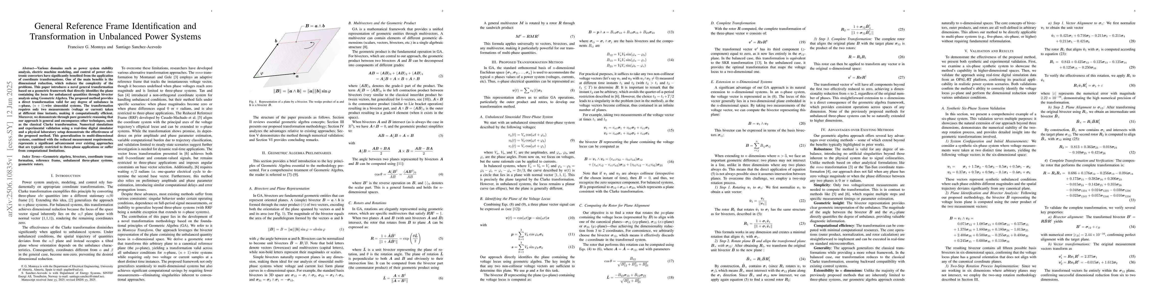 Various domains such as power system stability analysis, electric machine modeling, and control of power electronic converters have significantly benefited from the application of coordinate transformations. One of the main benefits is the dimensional reduction, which reduces the complexity of the problems. This paper introduces a novel general transformation based on a geometric framework that directly identifies the plane containing the locus for unbalanced quantities through bivector analysis using Geometric Algebra. The proposed method provides a direct transformation valid for any degree of unbalance in $n$-phase, $(n+1)$-wire sinusoidal systems. The transformation requires only two measurements (voltage or current) taken at different time instants, making it computationally efficient. Moreover, we demonstrate through pure geometric reasoning that our approach is general and encompasses other techniques, such as the classical Clarke transformation. Numerical simulations and experimental validation using a real-time digital simulator and a physical laboratory setup demonstrate the effectiveness of the proposed method. This generalization to multi-dimensional systems, combined with the reduced measurement requirements, represents a significant advancement over existing approaches that are typically restricted to three-phase applications or suffer from computational limitations.