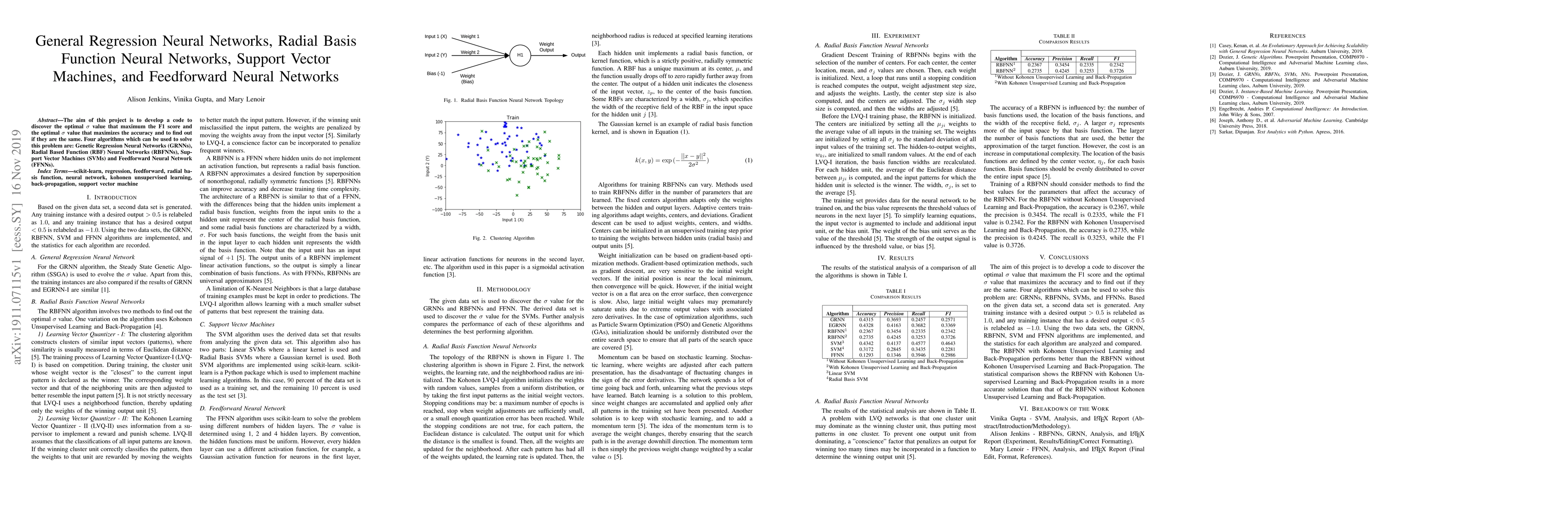 The aim of this project is to develop a code to discover the optimal sigma value that maximum the F1 score and the optimal sigma value that maximizes the accuracy and to find out if they are the same. Four algorithms which can be used to solve this problem are: Genetic Regression Neural Networks (GRNNs), Radial Based Function (RBF) Neural Networks (RBFNNs), Support Vector Machines (SVMs) and Feedforward Neural Network (FFNNs).