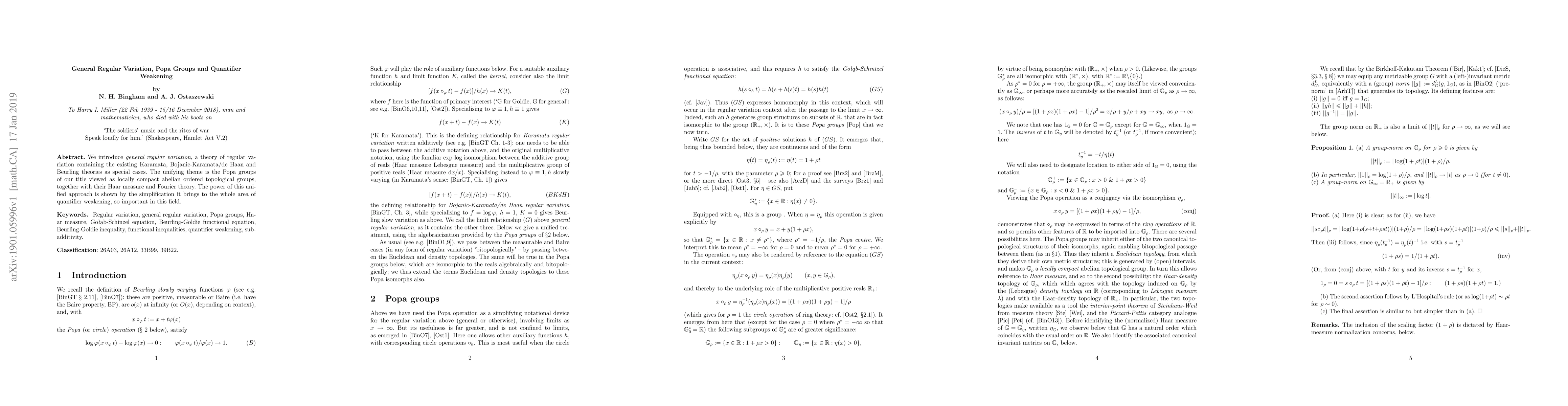 We introduce general regular variation, a theory of regular variation containing the existing Karamata, Bojanic-Karamata/de Haan and Beurling theories as special cases. The unifying theme is the Popa groups of our title viewed as locally compact abelian ordered topological groups, together with their Haar measure and Fourier theory. The power of this unified approach is shown by the simplification it brings to the whole area of quantifier weakening, so important in this field.
