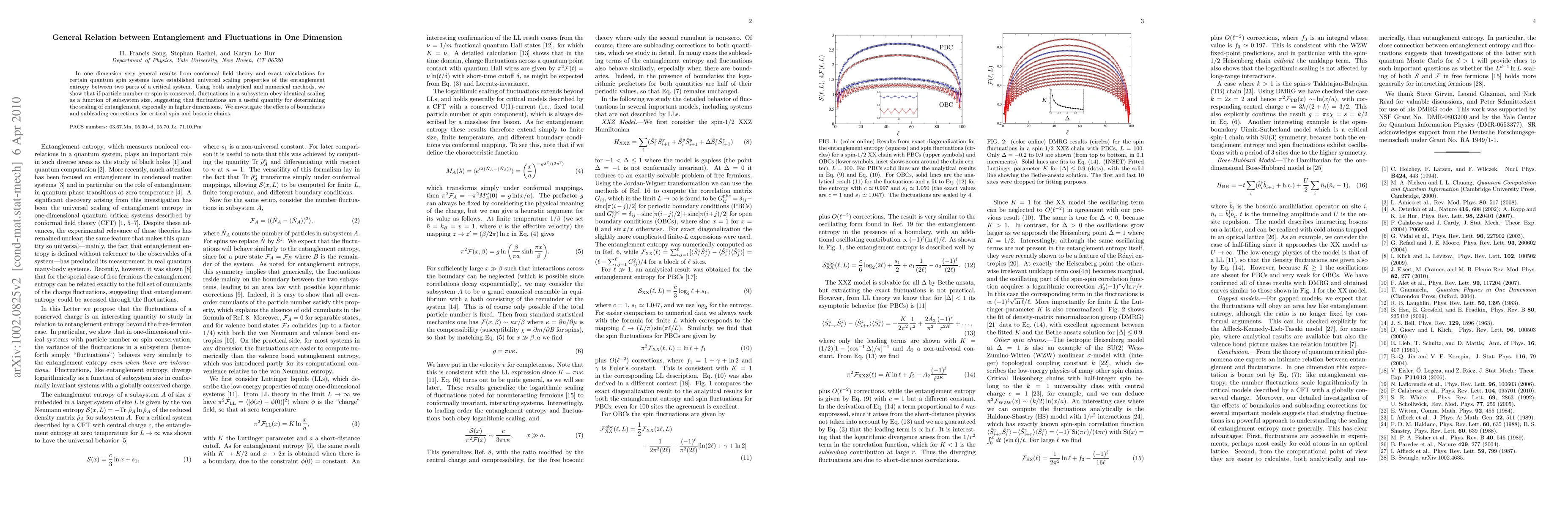 In one dimension very general results from conformal field theory and exact calculations for certain quantum spin systems have established universal scaling properties of the entanglement entropy between two parts of a critical system. Using both analytical and numerical methods, we show that if particle number or spin is conserved, fluctuations in a subsystem obey identical scaling as a function of subsystem size, suggesting that fluctuations are a useful quantity for determining the scaling of entanglement, especially in higher dimensions. We investigate the effects of boundaries and subleading corrections for critical spin and bosonic chains.