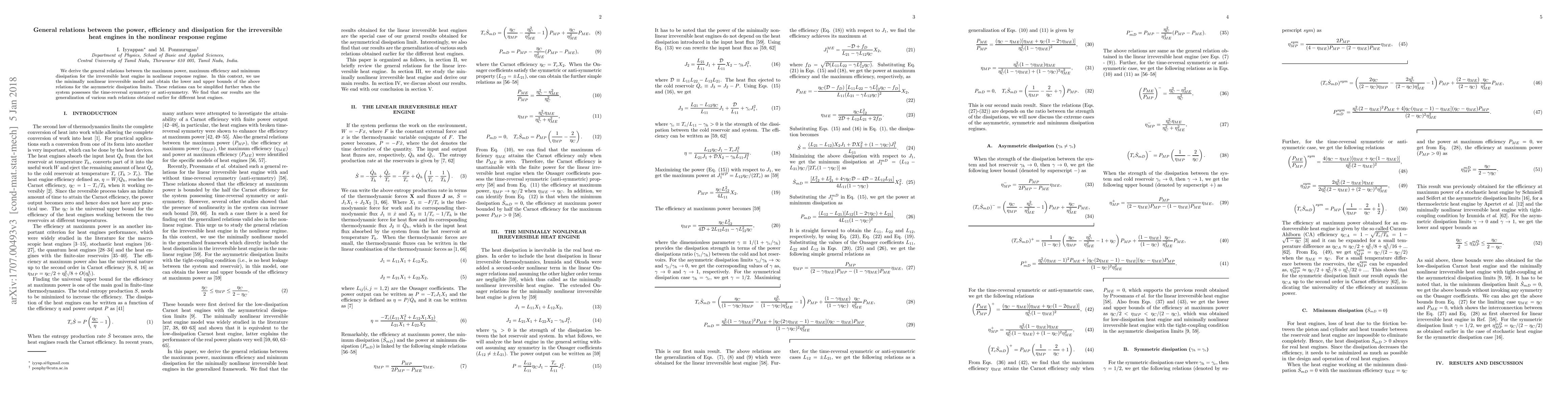 This paper derives general relations between maximum power, maximum efficiency, and minimum dissipation for irreversible heat engines operating in the nonlinear response regime, using a minimally nonlinear irreversible model. It establishes bounds for asymmetric dissipation limits and shows that these results generalize previous findings for different heat engines.