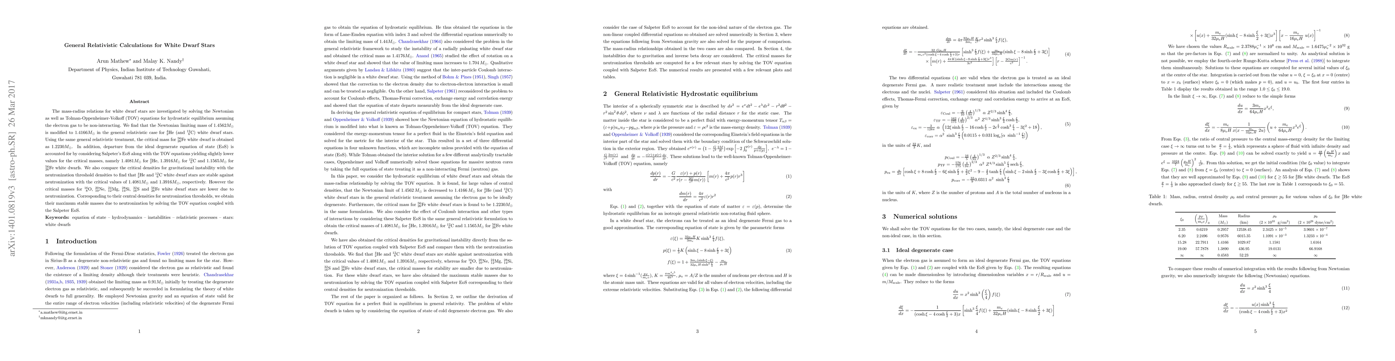 The mass-radius relations for white dwarf stars are investigated by solving the Newtonian as well as Tolman-Oppenheimer-Volkoff (TOV) equations for hydrostatic equilibrium assuming the electron gas to be non-interacting. We find that the Newtonian limiting mass of $1.4562M_\odot$ is modified to $1.4166M_\odot$ in the general relativistic case for $^4_2$He (and $^{12}_{\ 6}$C) white dwarf stars. Using the same general relativistic treatment, the critical mass for $^{56}_{26}$Fe white dwarf is obtained as $1.2230M_\odot$. In addition, departure from the ideal degenerate equation of state (EoS) is accounted for by considering Salpeter's EoS along with the TOV equations yielding slightly lower values for the critical masses, namely $1.4081M_{\odot}$ for $^4_2$He, $1.3916M_{\odot}$ for $^{12}_{\ 6}$C and $1.1565M_{\odot}$ for $^{56}_{26}$Fe white dwarfs. We also compare the critical densities for gravitational instability with the neutronization threshold densities to find that $^4_2$He and $^{12}_{\ 6}$C white dwarf stars are stable against neutronization with the critical values of $1.4081M_\odot$ and $1.3916M_{\odot}$, respectively. However the critical masses for $^{16}_{\ 8}$O, $^{20}_{10}$Ne, $^{24}_{12}$Mg, $^{28}_{14}$Si, $^{32}_{16}$S and $^{56}_{26}$Fe white dwarf stars are lower due to neutronization. Corresponding to their central densities for neutronization thresholds, we obtain their maximum stable masses due to neutronization by solving the TOV equation coupled with the Salpeter EoS.