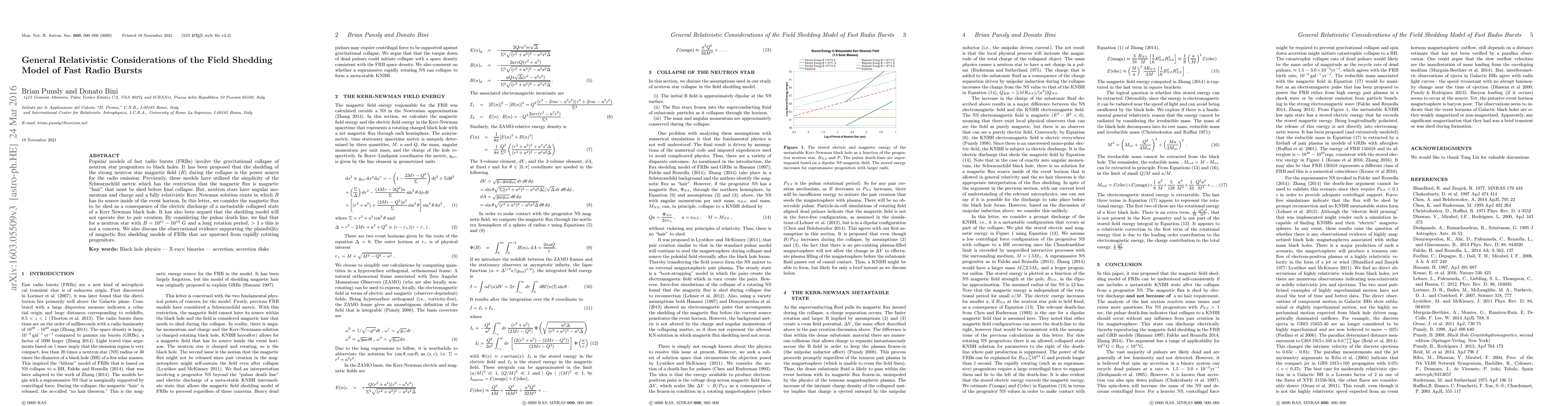 Popular models of fast radio bursts (FRBs) involve the gravitational collapse of neutron star progenitors to black holes. It has been proposed that the shedding of the strong neutron star magnetic field ($B$) during the collapse is the power source for the radio emission. Previously, these models have utilized the simplicity of the Schwarzschild metric which has the restriction that the magnetic flux is magnetic "hair" that must be shed before final collapse. But, neutron stars have angular momentum and charge and a fully relativistic Kerr Newman solution exists in which $B$ has its source inside of the event horizon. In this letter, we consider the magnetic flux to be shed as a consequence of the electric discharge of a metastable collapsed state of a Kerr Newman black hole. It has also been argued that the shedding model will not operate due to pair creation. By considering the pulsar death line, we find that for a neutron star with $B = 10^{11} - 10^{13}$ G and a long rotation period, $>1$ s this is not a concern. We also discuss the observational evidence supporting the plausibility of magnetic flux shedding models of FRBs that are spawned from rapidly rotating progenitors.