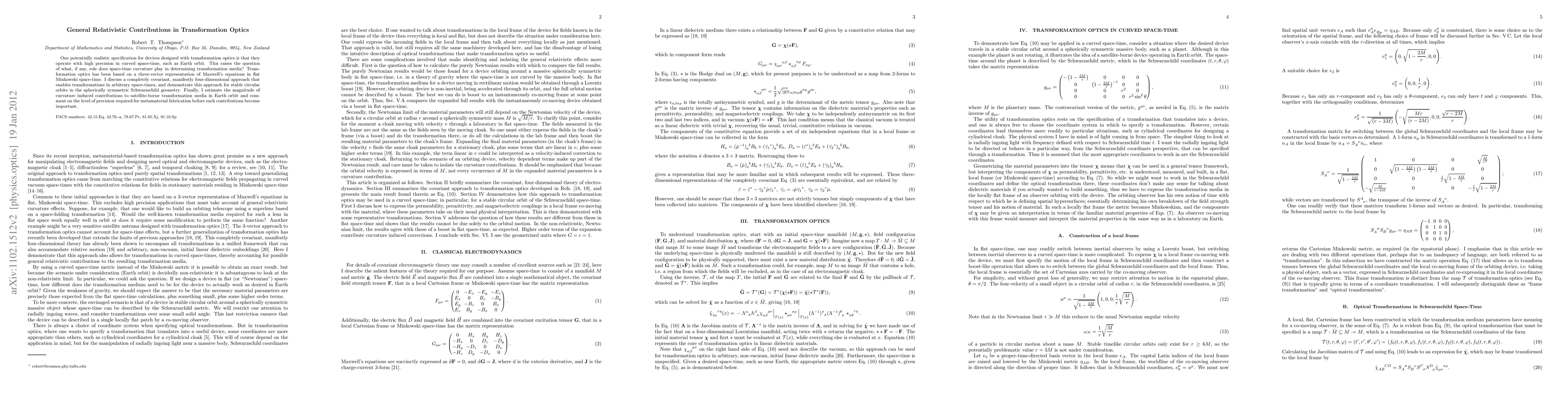One potentially realistic specification for devices designed with transformation optics is that they operate with high precision in curved space-time, such as Earth orbit. This raises the question of what, if any, role does space-time curvature play in determining transformation media? Transformation optics has been based on a three-vector representation of Maxwell's equations in flat Minkowski space-time. I discuss a completely covariant, manifestly four-dimensional approach that enables transformations in arbitrary space-times, and demonstrate this approach for stable circular orbits in the spherically symmetric Schwarzschild geometry. Finally, I estimate the magnitude of curvature induced contributions to satellite-borne transformation media in Earth orbit and comment on the level of precision required for metamaterial fabrication before such contributions become important.