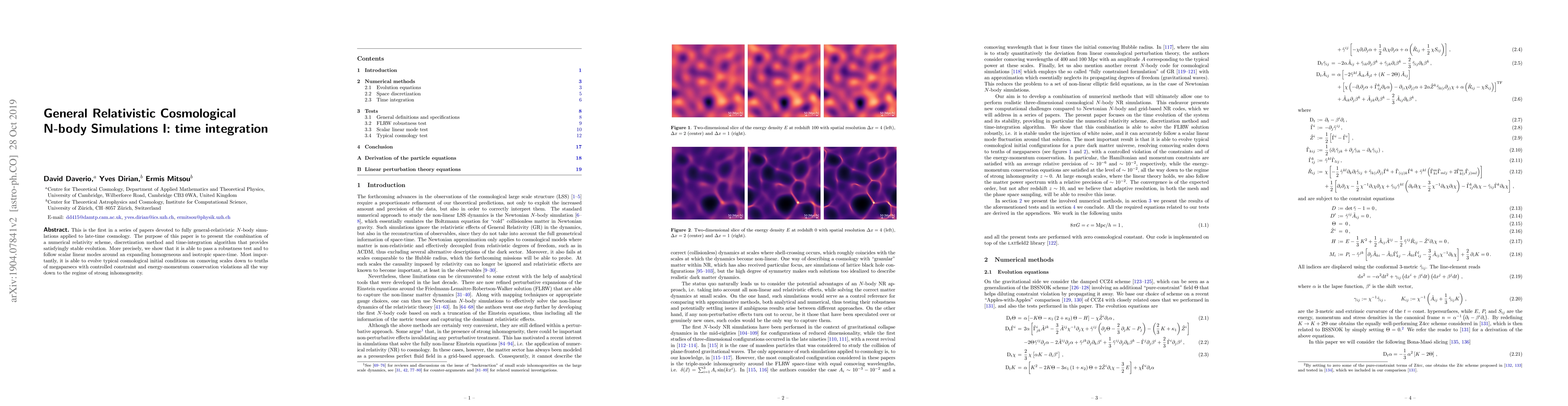 This is the first in a series of papers devoted to fully general-relativistic $N$-body simulations applied to late-time cosmology. The purpose of this paper is to present the combination of a numerical relativity scheme, discretization method and time-integration algorithm that provides satisfyingly stable evolution. More precisely, we show that it is able to pass a robustness test and to follow scalar linear modes around an expanding homogeneous and isotropic space-time. Most importantly, it is able to evolve typical cosmological initial conditions on comoving scales down to tenths of megaparsecs with controlled constraint and energy-momentum conservation violations all the way down to the regime of strong inhomogeneity.