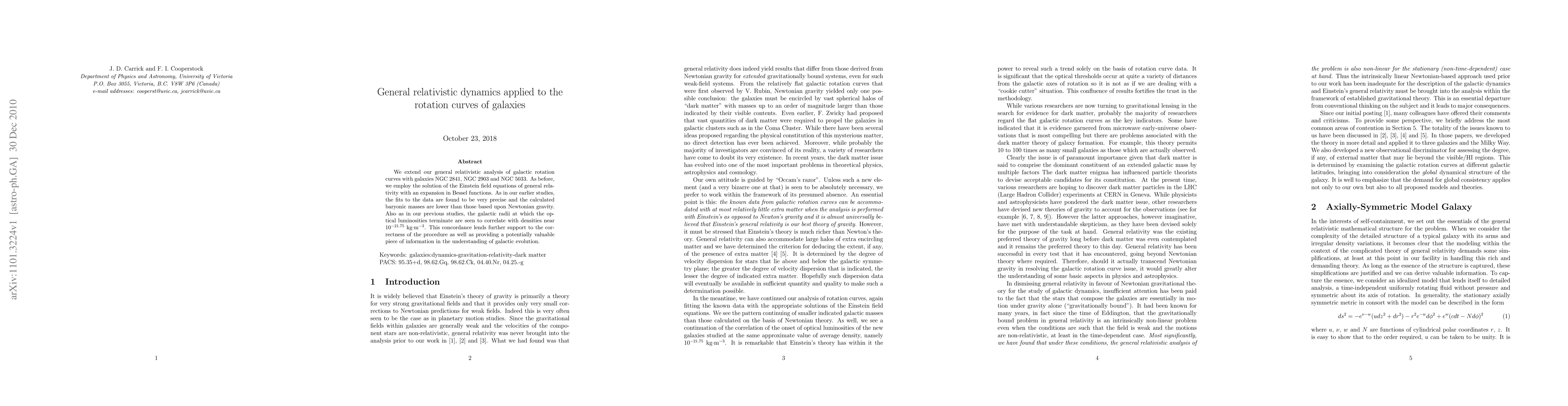 This paper applies general relativistic dynamics to the rotation curves of galaxies NGC 2841, NGC 2903, and NGC 5033, finding precise fits and lower baryonic masses compared to Newtonian gravity, with optical luminosity termination correlating with densities near $10^{-21.75}$ kg$\cdot$m$^{-3}$. This supports the method's accuracy and offers insights into galactic evolution.