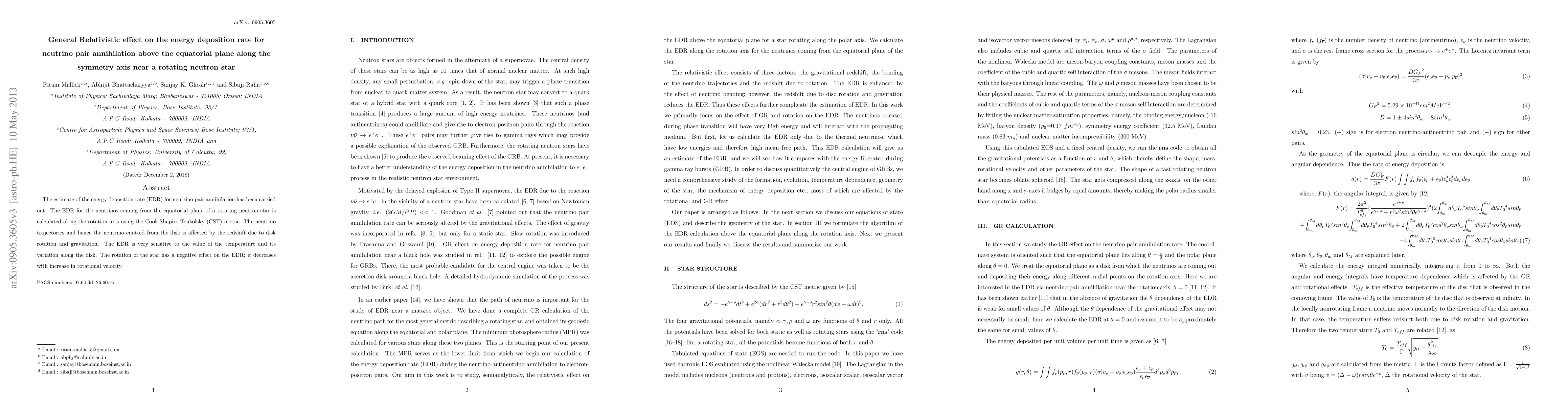 The estimate of the energy deposition rate (EDR) for neutrino pair annihilation has been carried out. The EDR for the neutrinos coming from the equatorial plane of a rotating neutron star is calculated along the rotation axis using the Cook-Shapiro-Teukolsky (CST) metric. The neutrino trajectories and hence the neutrino emitted from the disk is affected by the redshift due to disk rotation and gravitation. The EDR is very sensitive to the value of the temperature and its variation along the disk. The rotation of the star has a negative effect on the EDR; it decreases with increase in rotational velocity.