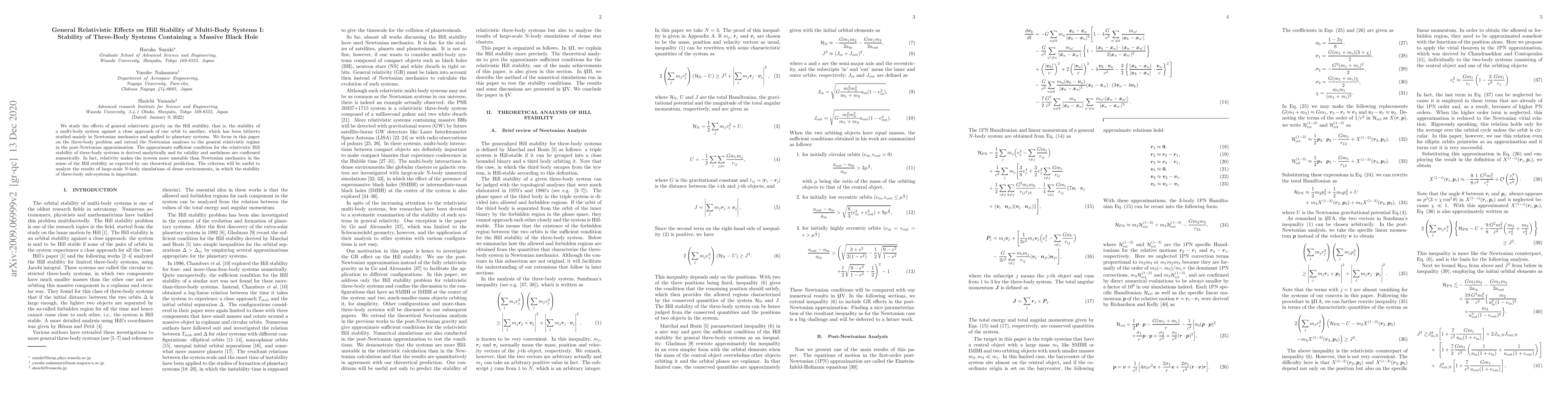 This paper investigates the impact of general relativistic effects on the Hill stability of three-body systems, particularly those containing a massive black hole. The authors derive an analytical condition for relativistic Hill stability in the post-Newtonian approximation and confirm its validity numerically, finding that relativity increases the system's instability compared to Newtonian predictions.