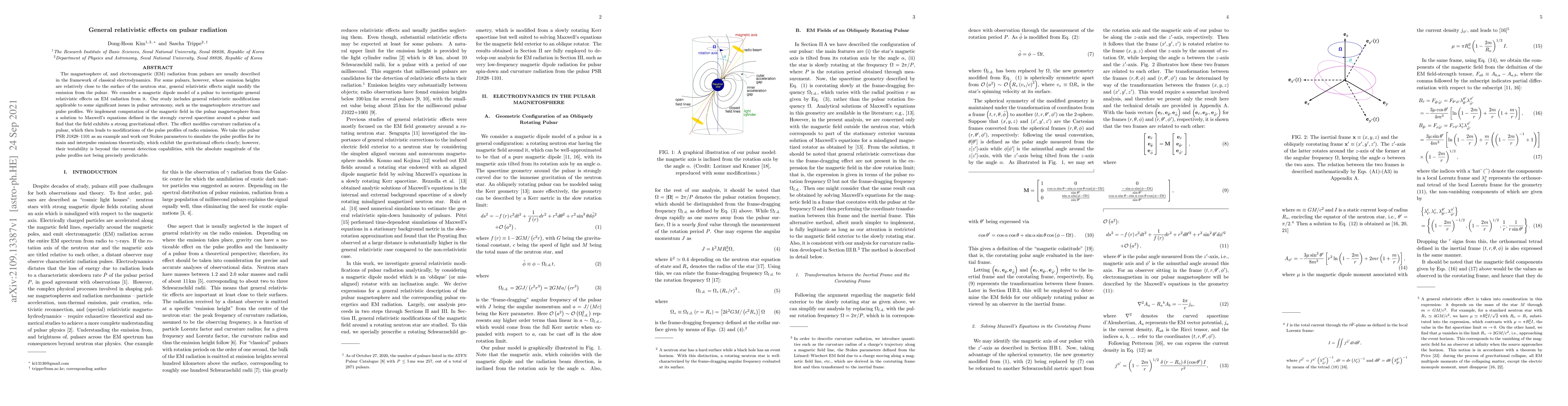 This paper investigates general relativistic effects on pulsar radiation, particularly focusing on the magnetosphere structure and pulse profiles. It finds that strong gravitational effects modify the curvature radiation and pulse profiles, exemplified by the pulsar PSR J1828-1101, though current detection capabilities do not allow precise prediction of these modifications.
