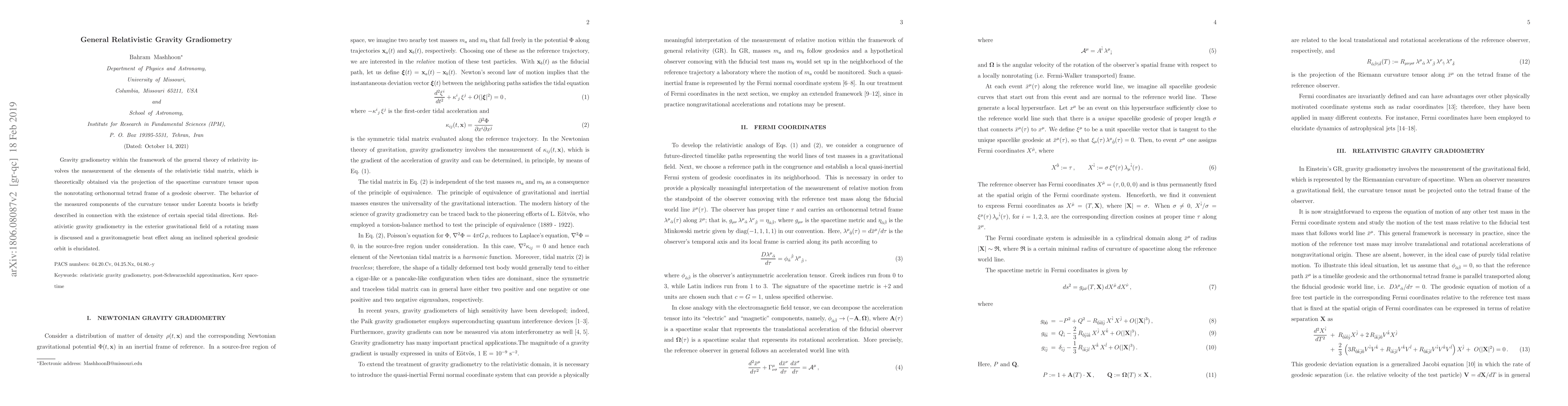 This paper explores gravity gradiometry in the context of general relativity, focusing on measuring the relativistic tidal matrix elements via the spacetime curvature tensor. It also discusses the behavior of these measurements under Lorentz boosts and introduces a gravitomagnetic beat effect in rotating mass fields.