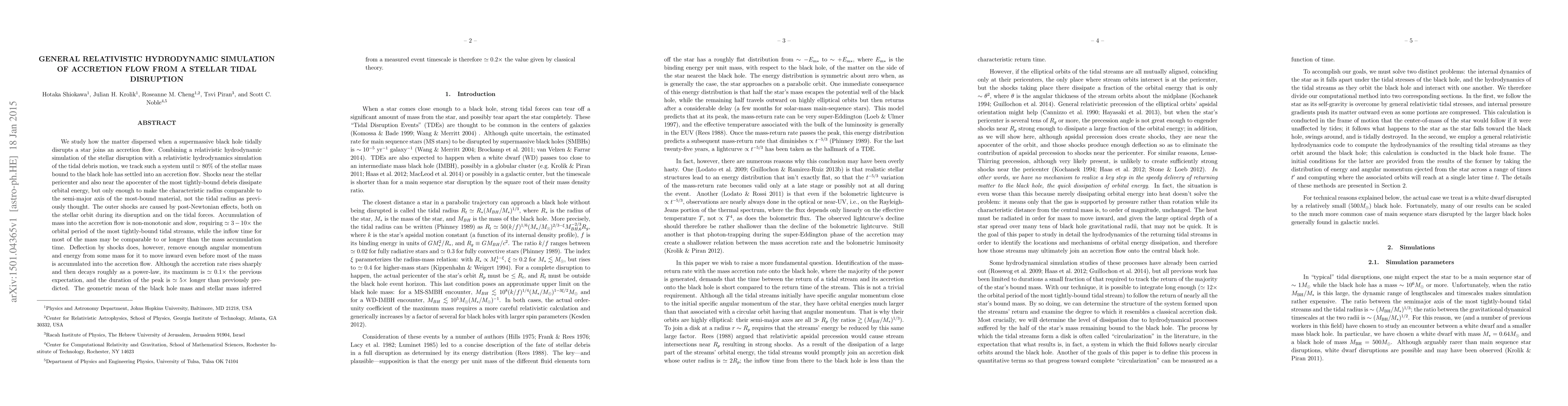 We study how the matter dispersed when a supermassive black hole tidally disrupts a star joins an accretion flow. Combining a relativistic hydrodynamic simulation of the stellar disruption with a relativistic hydrodynamics simulation of the tidal debris motion, we track such a system until ~80% of the stellar mass bound to the black hole has settled into an accretion flow. Shocks near the stellar pericenter and also near the apocenter of the most tightly-bound debris dissipate orbital energy, but only enough to make the characteristic radius comparable to the semi-major axis of the most-bound material, not the tidal radius as previously thought. The outer shocks are caused by post-Newtonian effects, both on the stellar orbit during its disruption and on the tidal forces. Accumulation of mass into the accretion flow is non-monotonic and slow, requiring ~3--10x the orbital period of the most tightly-bound tidal streams, while the inflow time for most of the mass may be comparable to or longer than the mass accumulation time. Deflection by shocks does, however, remove enough angular momentum and energy from some mass for it to move inward even before most of the mass is accumulated into the accretion flow. Although the accretion rate rises sharply and then decays roughly as a power-law, its maximum is ~0.1x the previous expectation, and the duration of the peak is ~5x longer than previously predicted. The geometric mean of the black hole mass and stellar mass inferred from a measured event timescale is therefore ~0.2x the value given by classical theory.