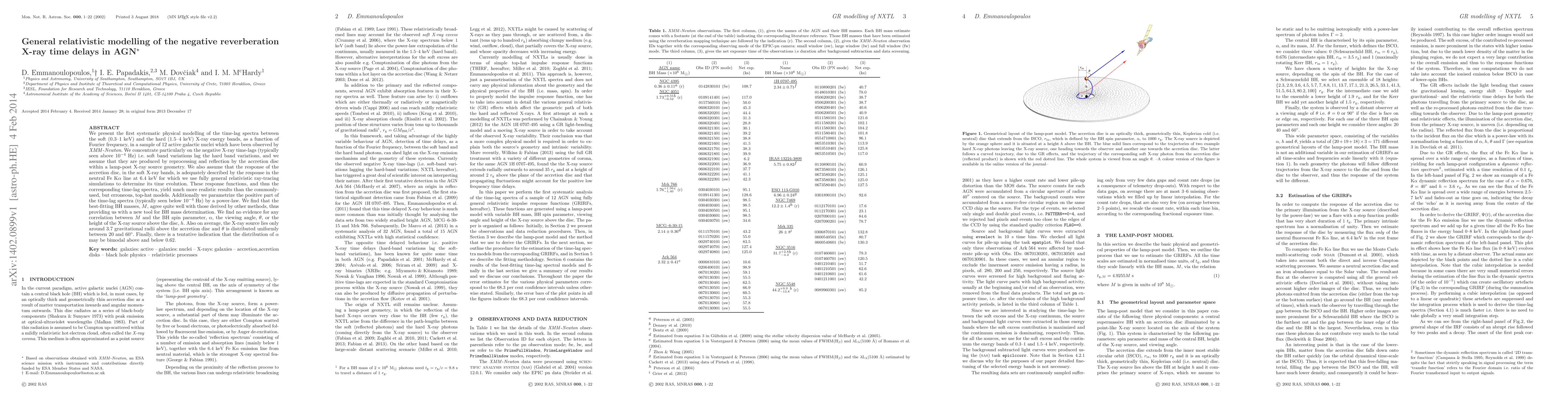 We present the first systematic physical modelling of the time-lag spectra between the soft (0.3-1 keV) and the hard (1.5-4 keV) X-ray energy bands, as a function of Fourier frequency, in a sample of 12 active galactic nuclei which have been observed by XMM-Newton. We concentrate particularly on the negative X-ray time-lags (typically seen above $10^{-4}$ Hz) i.e. soft band variations lag the hard band variations, and we assume that they are produced by reprocessing and reflection by the accretion disc within a lamp-post X-ray source geometry. We also assume that the response of the accretion disc, in the soft X-ray bands, is adequately described by the response in the neutral iron line (Fe k$\alpha$) at 6.4 keV for which we use fully general relativistic ray-tracing simulations to determine its time evolution. These response functions, and thus the corresponding time-lag spectra, yield much more realistic results than the commonly-used, but erroneous, top-hat models. Additionally we parametrize the positive part of the time-lag spectra (typically seen below $10^{-4}$ Hz) by a power-law. We find that the best-fitting BH masses, M, agree quite well with those derived by other methods, thus providing us with a new tool for BH mass determination. We find no evidence for any correlation between M and the BH spin parameter, $\alpha$, the viewing angle, $\theta$, or the height of the X-ray source above the disc, $h$. Also on average, the X-ray source lies only around 3.7 gravitational radii above the accretion disc and the viewing angles are distributed uniformly between 20 and 60 degrees. Finally, there is a tentative indication that the distribution of spin parameters may be bimodal above and below 0.62.