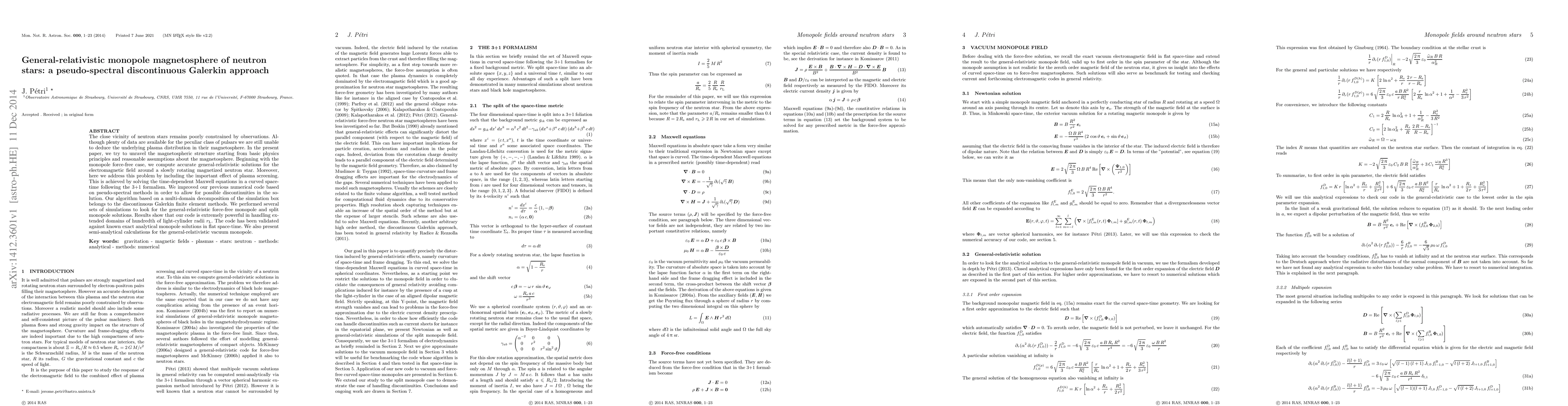 The close vicinity of neutron stars remains poorly constrained by observations. Although plenty of data are available for the peculiar class of pulsars we are still unable to deduce the underlying plasma distribution in their magnetosphere. In the present paper, we try to unravel the magnetospheric structure starting from basic physics principles and reasonable assumptions about the magnetosphere. Beginning with the monopole force-free case, we compute accurate general-relativistic solutions for the electromagnetic field around a slowly rotating magnetized neutron star. Moreover, here we address this problem by including the important effect of plasma screening. This is achieved by solving the time-dependent Maxwell equations in a curved space-time following the 3+1~formalism. We improved our previous numerical code based on pseudo-spectral methods in order to allow for possible discontinuities in the solution. Our algorithm based on a multi-domain decomposition of the simulation box belongs to the discontinuous Galerkin finite element methods. We performed several sets of simulations to look for the general-relativistic force-free monopole and split monopole solutions. Results show that our code is extremely powerful in handling extended domains of hundredth of light-cylinder radii~$\rlight$. The code has been validated against known exact analytical monopole solutions in flat space-time. We also present semi-analytical calculations for the general-relativistic vacuum monopole.