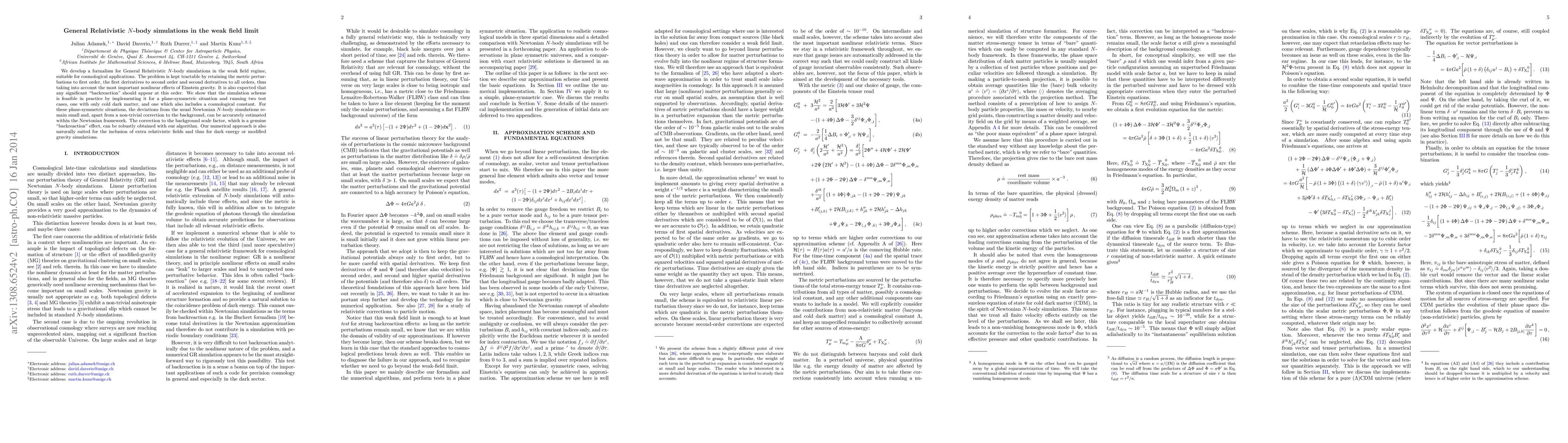 This paper presents a new formalism for General Relativistic N-body simulations in the weak field limit, focusing on cosmological applications. The method retains metric perturbations to first order, ensuring accurate inclusion of nonlinear effects while keeping the problem tractable.
